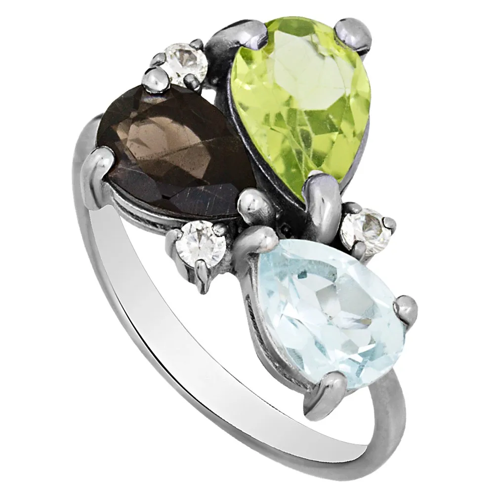 Серебряное кольцо "Капель" с натуральными камнями хризолит, голубой топаз Sky и раухтопаз, без покрытия. Средний вес украшения с камнями 3,05 гр. Месторождение(я) камней: Хризолит (Якутия, Россия) , Топаз (Ильменские горы, Россия), Раухтопаз (Дымчатый кварц) (м-ние Додо ХМАО, Россия). Хризолит (Натуральный) груша: 6*9 мм., средний вес 1,00 карат. Раухтопаз (Натуральный) груша: 5*7 мм., средний вес 0,70 карат. Топаз (Натуральный) груша: 5*7 мм., средний вес 0,80 карат.