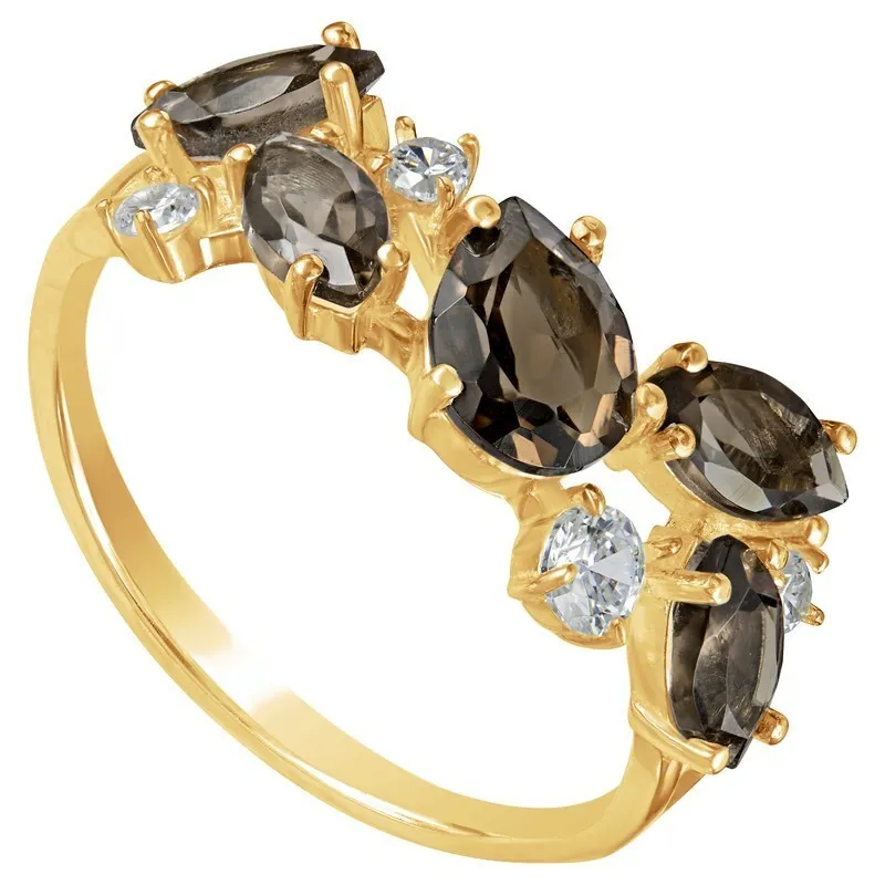 Серебряное кольцо с натуральным раухтопазом - коллекция Росинка. Серебряное кольцо 925 пробы с покрытием желтое золото. Цвет покрытия соответствует швейцарскому цветовому стандарту NIHS -FF24ct и цвету чистого золото 999.99. На последней фотографии мы разместили сравнительную фотографию 3 цвета золотого покрытия. Помимо предания золотого цвета Вашему изделию, тонкий слой золота защищает от окисления. Для более стойкого эффекта золочения и долговечности покрытия мы дополнительно наносим подслой палладия (Pd). Средний вес изделия с камнями 2.51 гр. Месторождение: Раухтопаз (Дымчатый кварц) (м-ние Додо ХМАО, Россия). Раухтопаз (Натуральный) груша 5*7 мм., средний вес: 0.63 карат. Все изделия собственного производства, гарантия 12 месяцев. Арт. 8436. Раухтопаз – это разновидность кварца. Ранее он использовался в ювелирных украшениях, при вышивке картин, для магических ритуалов. Его влияние на владельца сразу становится заметно — человек успокаивается и становится рассудительным, легче выходит из депрессивных состояний. Часто использовался в приворотах, заговорах или для связи с миром духов.