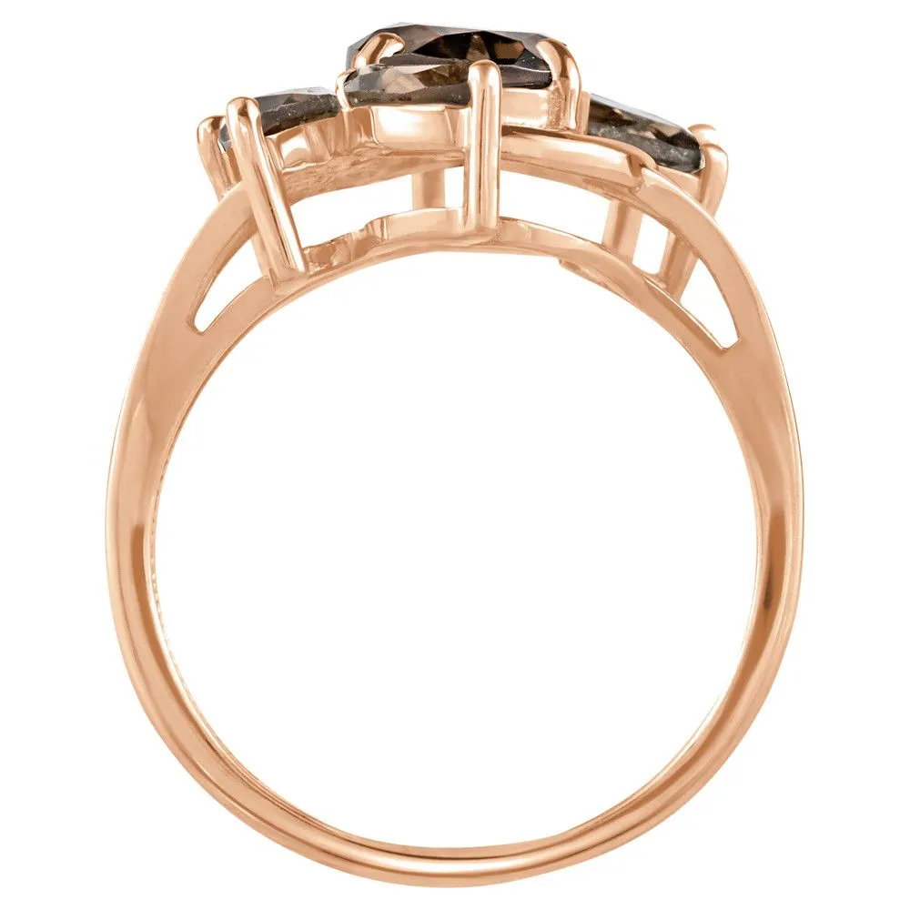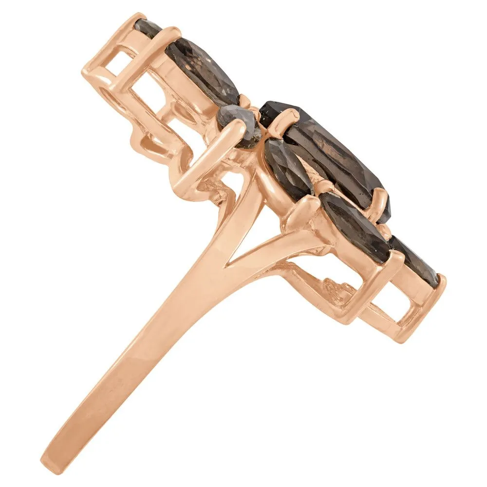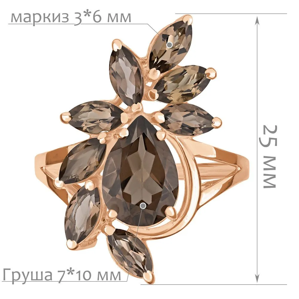 Серебряное кольцо "Элегия" с натуральным раухтопазом (дымчатый кварц) , покрытие Красное Золото. Средний вес украшения с камнями 3,43 гр. Месторождение(я) камней: Раухтопаз (Дымчатый кварц) (м-ние Додо ХМАО, Россия). Раухтопаз (Натуральный) груша: 7*10 мм., средний вес 1,85 карат. Раухтопаз (Натуральный) маркиз: 3*6 мм., средний вес 0,24 карат. Размер лицевой части: 15*23 мм. Все изделия собственного производства и имеют гарантию 12 месяцев. Арт. 6610RG. Раухтопаз – это разновидность кварца. Ранее он использовался в ювелирных украшениях, при вышивке картин, для магических ритуалов. Его влияние на владельца сразу становится заметно — человек успокаивается и становится рассудительным, легче выходит из депрессивных состояний. Часто использовался в приворотах, заговорах или для связи с миром духов.