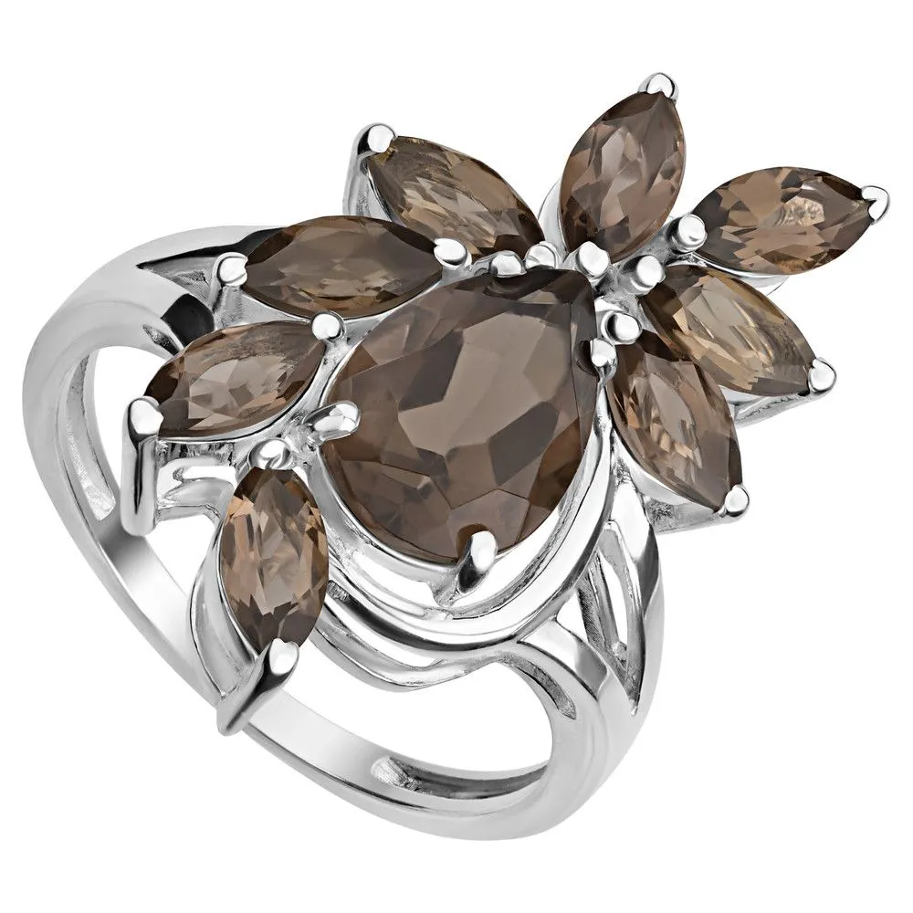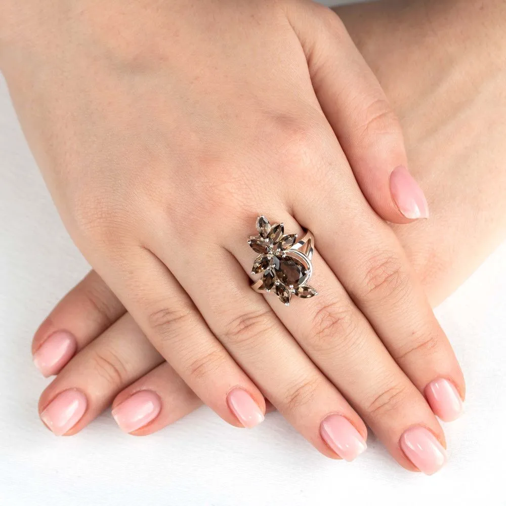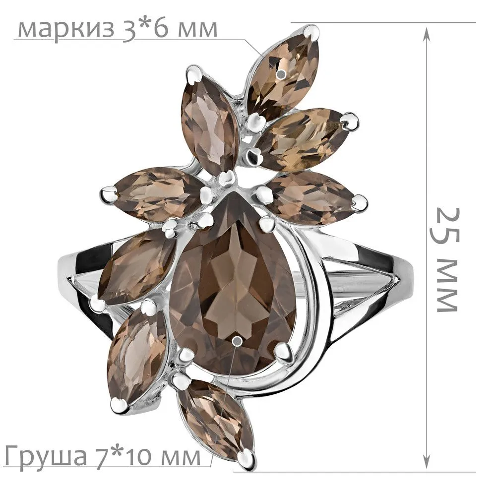 Серебряное кольцо "Элегия" с натуральным раухтопазом (дымчатый кварц) , покрытие Белый Родий. Средний вес украшения с камнями 3,43 гр. Месторождение(я) камней: Раухтопаз (Дымчатый кварц) (м-ние Додо ХМАО, Россия). Раухтопаз (Натуральный) груша: 7*10 мм., средний вес 1,85 карат. Раухтопаз (Натуральный) маркиз: 3*6 мм., средний вес 0,24 карат. Размер лицевой части: 15*23 мм. Все изделия собственного производства и имеют гарантию 12 месяцев. Арт. 6610WR. Раухтопаз – это разновидность кварца. Ранее он использовался в ювелирных украшениях, при вышивке картин, для магических ритуалов. Его влияние на владельца сразу становится заметно — человек успокаивается и становится рассудительным, легче выходит из депрессивных состояний. Часто использовался в приворотах, заговорах или для связи с миром духов.