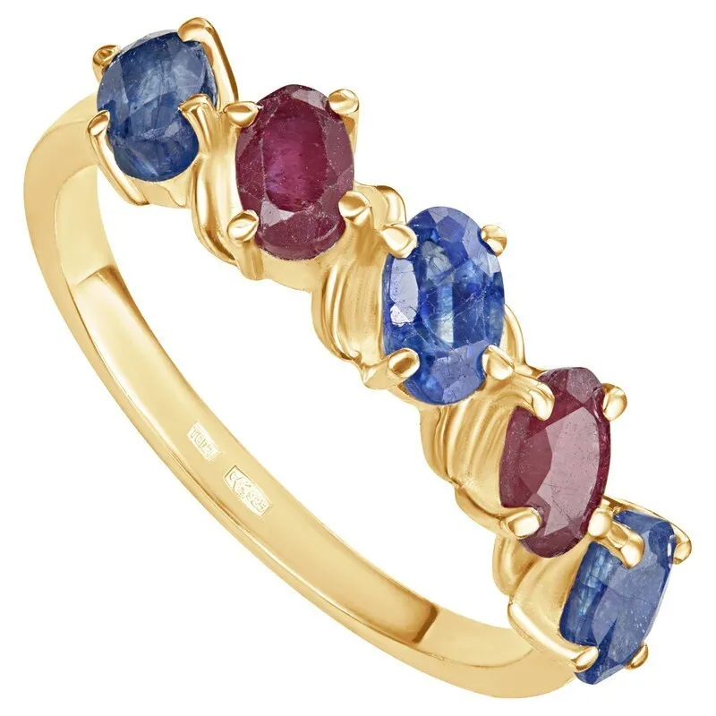 Серебряное кольцо с натуральными камнями сапфир и рубин - коллекция Колосок. Серебряное кольцо 925 пробы с покрытием желтое золото. Цвет покрытия соответствует швейцарскому цветовому стандарту NIHS -FF24ct и цвету чистого золото 999.99. На последней фотографии мы разместили сравнительную фотографию 3 цвета золотого покрытия. Помимо предания золотого цвета Вашему изделию, тонкий слой золота защищает от окисления. Для более стойкого эффекта золочения и долговечности покрытия мы дополнительно наносим подслой палладия (Pd). Средний вес изделия с камнями 2.2 гр. Месторождения: Сапфир (Мадагаскар) и Рубин (Восточная Африка) Сапфир (Натуральный) овал 3*5 мм., средний вес: 0.39 карат. Рубин (Натуральный) овал 3*5 мм., средний вес: 0.30 карат. Все изделия собственного производства, гарантия 12 месяцев. Арт. 8038
