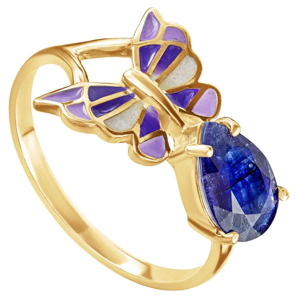 Серебряное кольцо с натуральным сапфиром и эмалью - коллекция Бабочка, покрытие Желтое Золото. Средний вес украшения с камнями 2.55 гр. Месторождение: Сапфир (Мадагаскар). Сапфир (Натуральный) груша 6*9 мм., средний вес: 1.83 карат. Все изделия собственного производства и имеют гарантию 12 месяцев, к каждому изделию прилагается паспорт. Арт. 8455YG. Сапфир – это разновидность корунда. Камням различных оттенков приписывались разные свойства. Синие чаще всего ассоциировались с властью. Особенно ценятся звёздчатые сапфиры. Данный минерал часто именуют камнем небес и соотносят с божественным даром. Им дано усмирять человеческие страсти и укреплять волю.