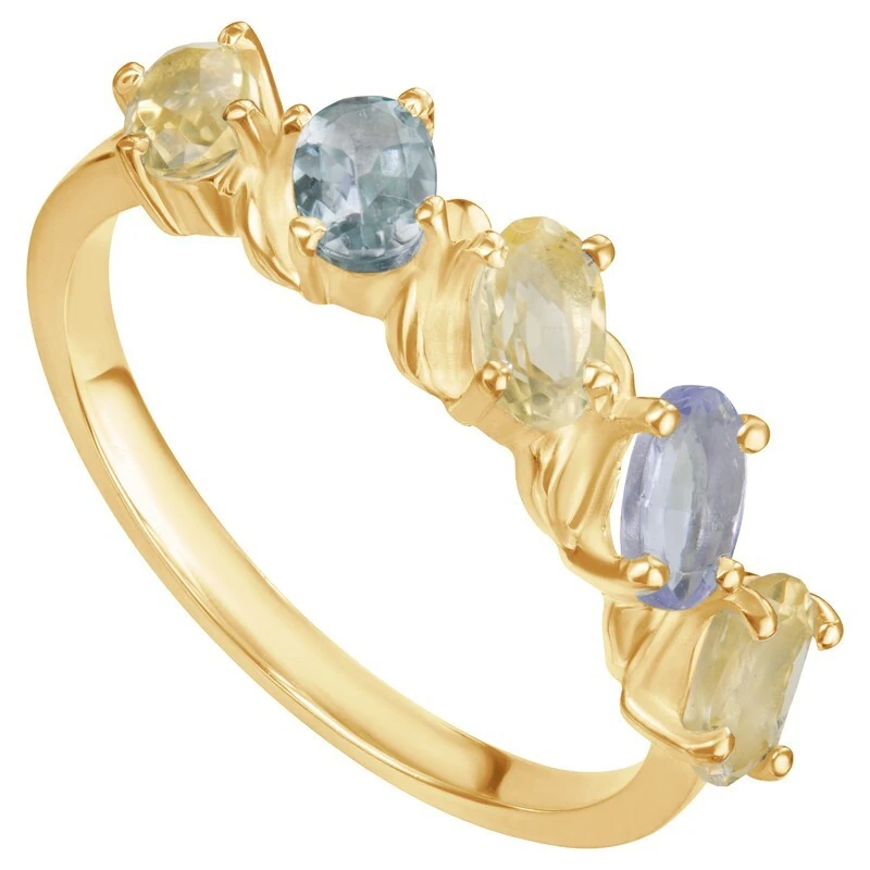 Серебряное кольцо с натуральными камнями цитрин и танзанит - коллекция Колосок. Серебряное кольцо 925 пробы с покрытием желтое золото. Цвет покрытия соответствует швейцарскому цветовому стандарту NIHS -FF24ct и цвету чистого золото 999.99. На последней фотографии мы разместили сравнительную фотографию 3 цвета золотого покрытия. Помимо предания золотого цвета Вашему изделию, тонкий слой золота защищает от окисления. Для более стойкого эффекта золочения и долговечности покрытия мы дополнительно наносим подслой палладия (Pd). Средний вес изделия с камнями 2.24 гр. Месторождения: Цитрин (Урал, Россия) и Танзанит (провинция Аруша, Танзания) Цитрин (Натуральный) овал 3*5 мм., средний вес: 0.24 карат. Танзанит (Натуральный) овал 3*5 мм., средний вес: 0.24 карат. Все изделия собственного производства, гарантия 12 месяцев. Арт. 8043