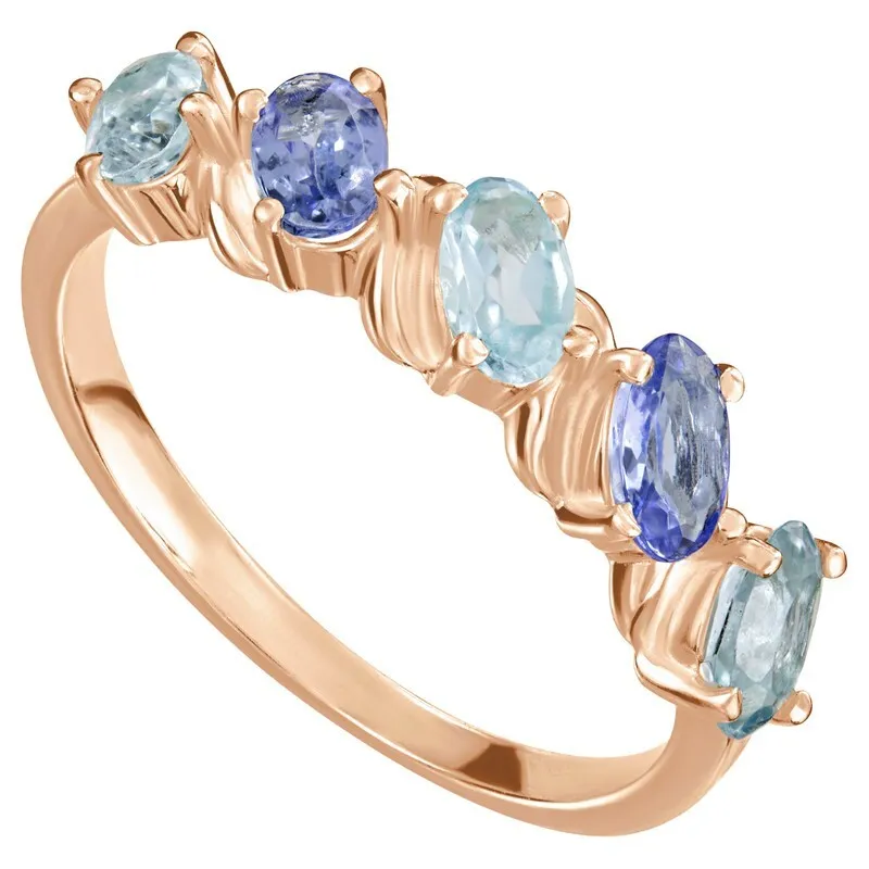 Серебряное кольцо с натуральными камнями топаз и танзанит - коллекция Колосок. Серебряное кольцо 925 пробы с покрытием красное золото. Цвет покрытия соответствует швейцарскому цветовому стандарту NIHS -5N и цвету красного золота 585 в России. На последней фотографии мы разместили сравнительную фотографию 3 цвета золотого покрытия. Помимо предания золотого цвета Вашему изделию, тонкий слой золота защищает от окисления. Для более стойкого эффекта золочения и долговечности покрытия мы дополнительно наносим подслой палладия (Pd). Средний вес изделия с камнями 2.39 гр. Месторождения: Голубой топаз (Ильменские горы, Россия) и Танзанит (провинция Аруша, Танзания). Топаз (Натуральный) овал 3*5 мм., средний вес: 0.32 карат. и Танзанит (Натуральный) овал 3*5 мм., средний вес: 0.24 карат. Все изделия собственного производства, гарантия 12 месяцев. Арт. 8050