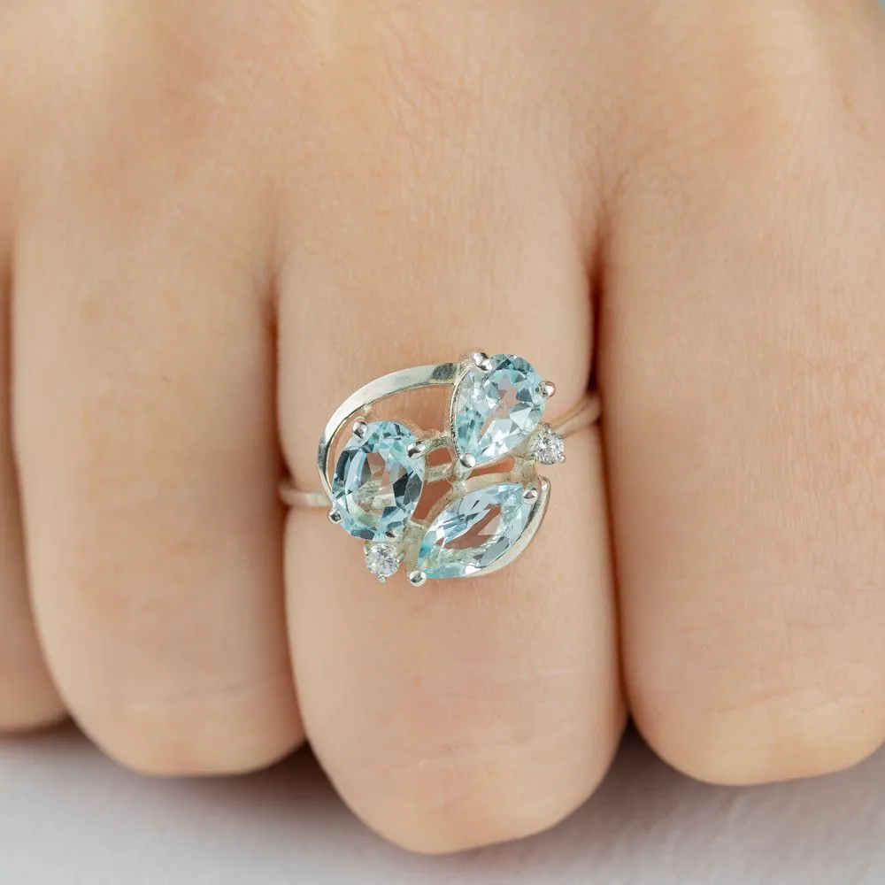 Серебряное кольцо "Фортуна" с натуральным голубым топазом, покрытие Чистое Серебро. Средний вес украшения с камнями 3,16 гр. Месторождение(я) камней: Топаз (Ильменские горы, Россия). Топаз (Натуральный) маркиз: 4*8 мм., средний вес 0,65 карат. Топаз (Натуральный) овал: 5*7 мм., средний вес 0,90 карат. Топаз (Натуральный) груша: 5*7 мм., средний вес 0,80 карат. Циркон белый (Натуральный) круг: 2 мм., средний вес 0,05 карат. Размер лицевой части: 13*15 мм. Все изделия собственного производства и имеют гарантию 12 месяцев. Арт. 6614AG