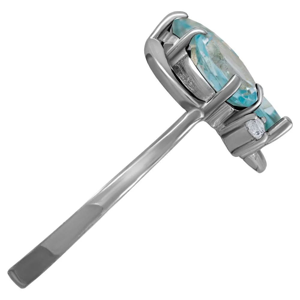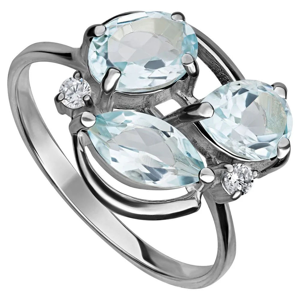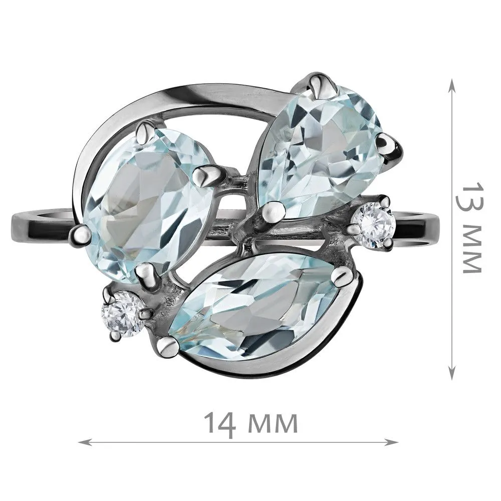 Серебряное кольцо "Фортуна" с натуральным голубым топазом, покрытие Палладий. Средний вес украшения с камнями 3,16 гр. Месторождение(я) камней: Топаз (Ильменские горы, Россия). Топаз (Натуральный) маркиз: 4*8 мм., средний вес 0,65 карат. Топаз (Натуральный) овал: 5*7 мм., средний вес 0,90 карат. Топаз (Натуральный) груша: 5*7 мм., средний вес 0,80 карат. Циркон белый (Натуральный) круг: 2 мм., средний вес 0,05 карат. Размер лицевой части: 13*15 мм. Все изделия собственного производства и имеют гарантию 12 месяцев. Арт. 6614PD