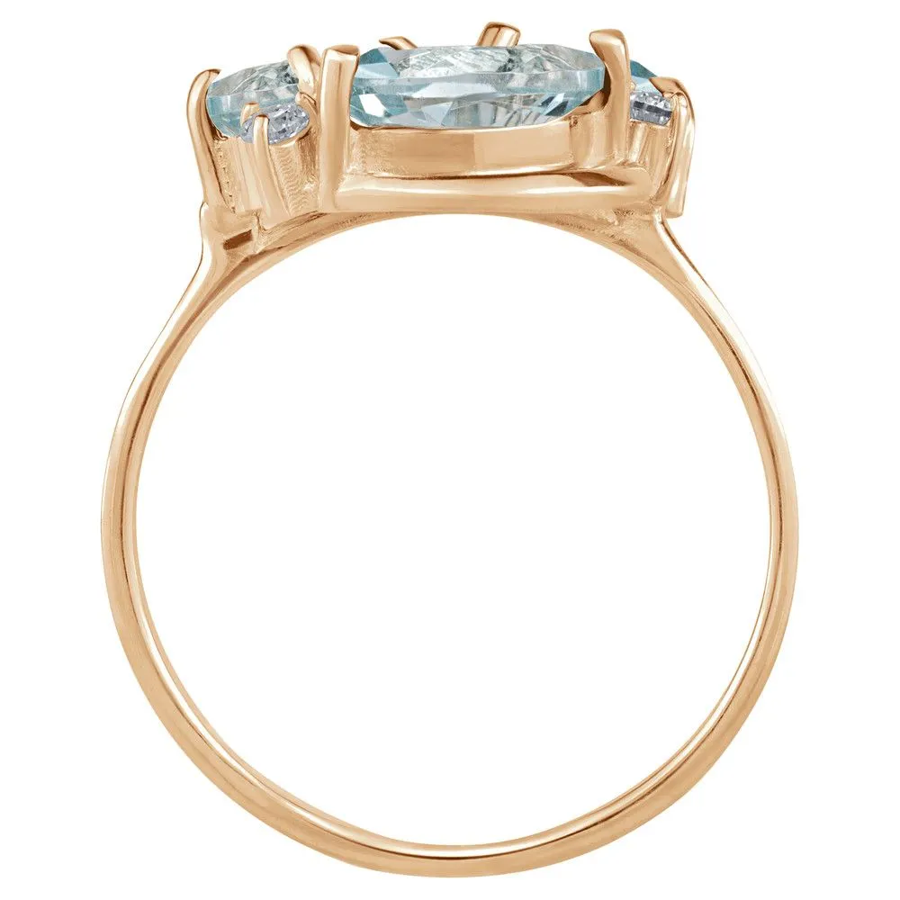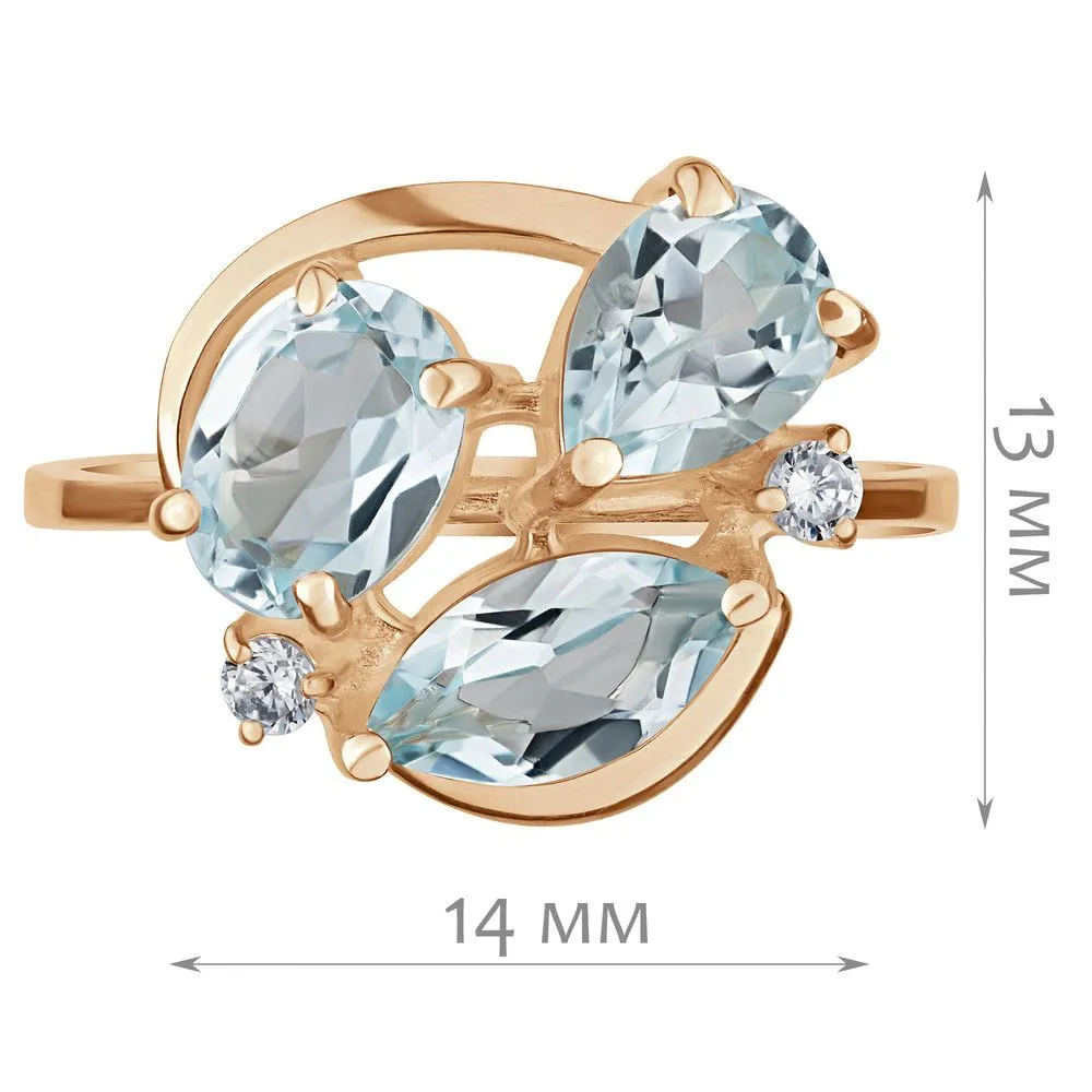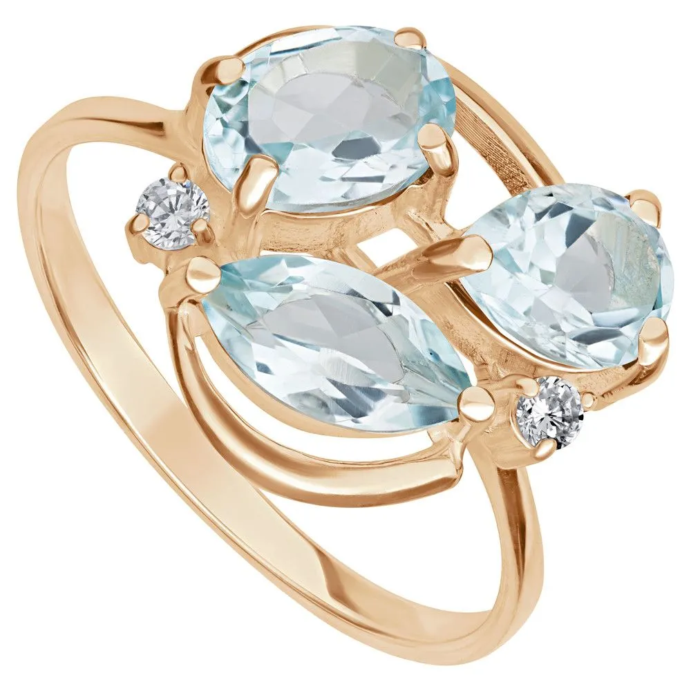 Серебряное кольцо "Фортуна" с натуральным голубым топазом, покрытие Розовое Золото. Средний вес украшения с камнями 3,16 гр. Месторождение(я) камней: Топаз (Ильменские горы, Россия). Топаз (Натуральный) маркиз: 4*8 мм., средний вес 0,65 карат. Топаз (Натуральный) овал: 5*7 мм., средний вес 0,90 карат. Топаз (Натуральный) груша: 5*7 мм., средний вес 0,80 карат. Циркон белый (Натуральный) круг: 2 мм., средний вес 0,05 карат. Размер лицевой части: 13*15 мм. Все изделия собственного производства и имеют гарантию 12 месяцев. Арт. 6614PG