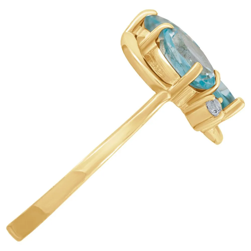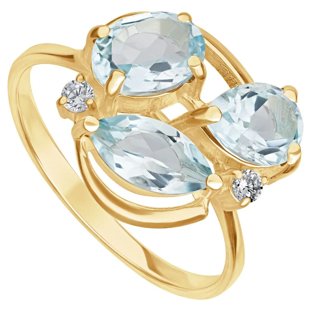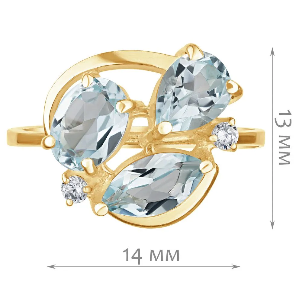 Серебряное кольцо "Фортуна" с натуральным голубым топазом, покрытие Желтое Золото. Средний вес украшения с камнями 3,16 гр. Месторождение(я) камней: Топаз (Ильменские горы, Россия). Топаз (Натуральный) маркиз: 4*8 мм., средний вес 0,65 карат. Топаз (Натуральный) овал: 5*7 мм., средний вес 0,90 карат. Топаз (Натуральный) груша: 5*7 мм., средний вес 0,80 карат. Циркон белый (Натуральный) круг: 2 мм., средний вес 0,05 карат. Размер лицевой части: 13*15 мм. Все изделия собственного производства и имеют гарантию 12 месяцев. Арт. 6614YG