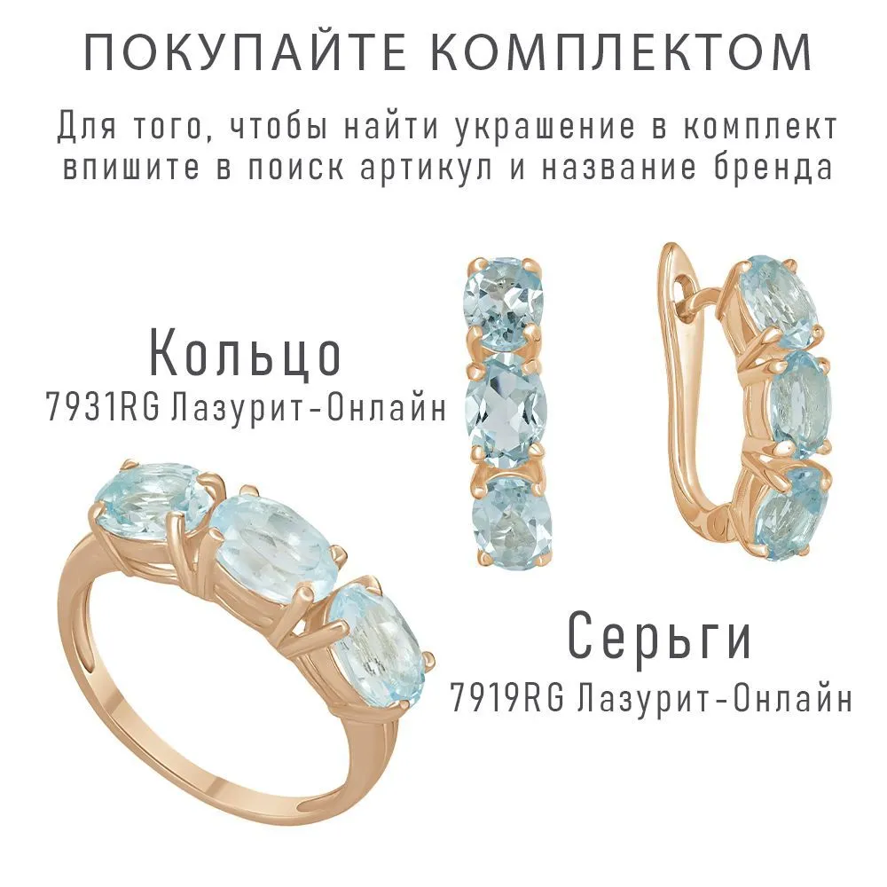 Серебряное кольцо с натуральным топазом - коллекция Муза. Серебряное кольцо 925 пробы с покрытием красное золото. Цвет покрытия соответствует швейцарскому цветовому стандарту NIHS -5N и цвету красного золота 585 в России. На последней фотографии мы разместили сравнительную фотографию 3 цвета золотого покрытия. Помимо предания золотого цвета Вашему изделию, тонкий слой золота защищает от окисления. Для более стойкого эффекта золочения и долговечности покрытия мы дополнительно наносим подслой палладия (Pd). Средний вес изделия с камнями 2.38 гр. Месторождение(я): Голубой топаз (Ильменские горы, Россия) Топаз (Натуральный) овал 5*7 мм., средний вес: 0,89 карат. Размер лицевой части: 5*21 мм. Все изделия собственного производства, гарантия 12 месяцев. Арт. 7931
