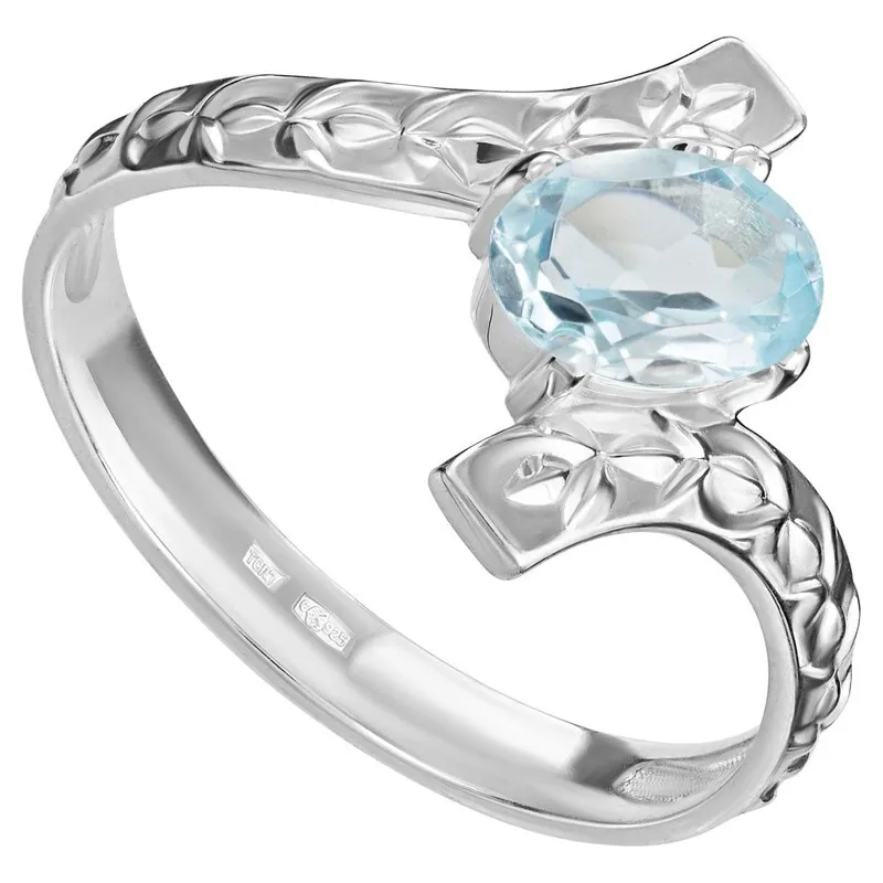 Серебряное кольцо с натуральным голубым топазом - коллекция Тея. Средний вес изделия с камнями 2.44 гр. Месторождение: Голубой топаз (Ильменские горы, Россия) Топаз (Натуральный) овал 5*7 мм., средний вес: 0.89 карат. Все изделия собственного производства, гарантия 12 месяцев. Арт. 8063