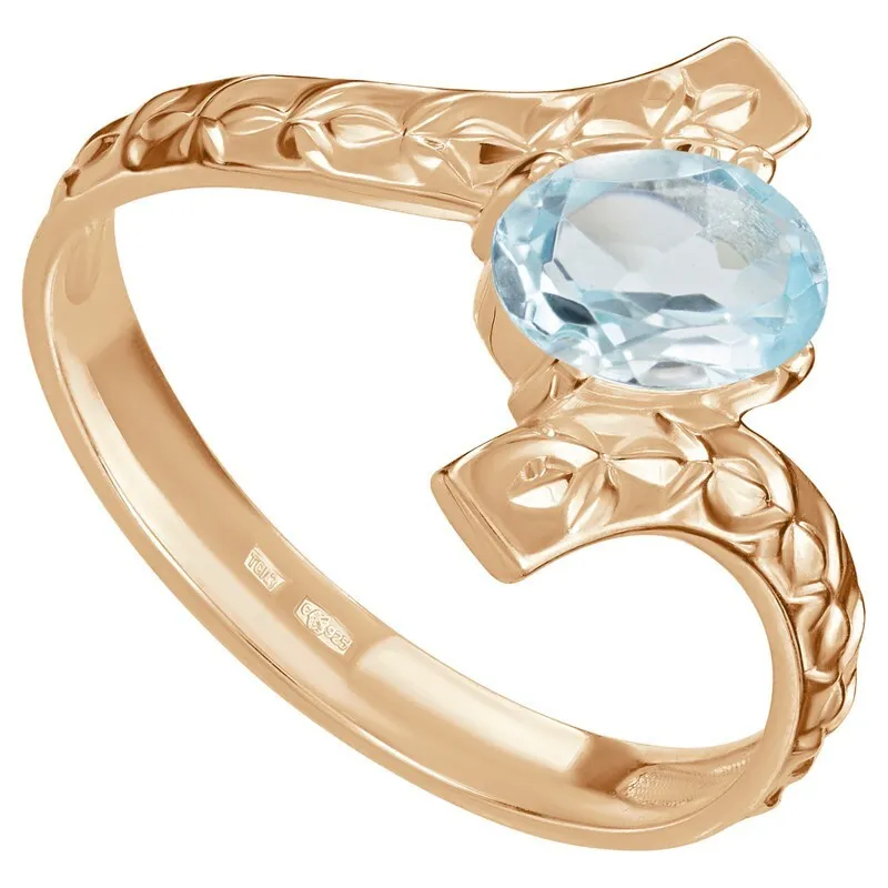 Серебряное кольцо с натуральным голубым топазом - коллекция Тея. Серебряное кольцо 925 пробы с покрытием розовое золото. Цвет покрытия соответствует швейцарскому цветовому стандарту NIHS -4N и цвету розового золота 585 в России. На последней фотографии мы разместили сравнительную фотографию 3 цвета золотого покрытия. Помимо предания золотого цвета Вашему изделию, тонкий слой золота защищает от окисления. Для более стойкого эффекта золочения и долговечности покрытия мы дополнительно наносим подслой палладия (Pd). Средний вес изделия с камнями 2.44 гр. Месторождение: Голубой топаз (Ильменские горы, Россия) Топаз (Натуральный) овал 5*7 мм., средний вес: 0.89 карат. Все изделия собственного производства, гарантия 12 месяцев. Арт. 8063