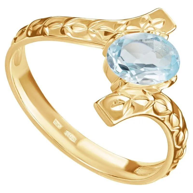 Серебряное кольцо с натуральным голубым топазом - коллекция Тея. Серебряное кольцо 925 пробы с покрытием желтое золото. Цвет покрытия соответствует швейцарскому цветовому стандарту NIHS -FF24ct и цвету чистого золото 999.99. На последней фотографии мы разместили сравнительную фотографию 3 цвета золотого покрытия. Помимо предания золотого цвета Вашему изделию, тонкий слой золота защищает от окисления. Для более стойкого эффекта золочения и долговечности покрытия мы дополнительно наносим подслой палладия (Pd). Средний вес изделия с камнями 2.44 гр. Месторождение: Голубой топаз (Ильменские горы, Россия) Топаз (Натуральный) овал 5*7 мм., средний вес: 0.89 карат. Все изделия собственного производства, гарантия 12 месяцев. Арт. 8063