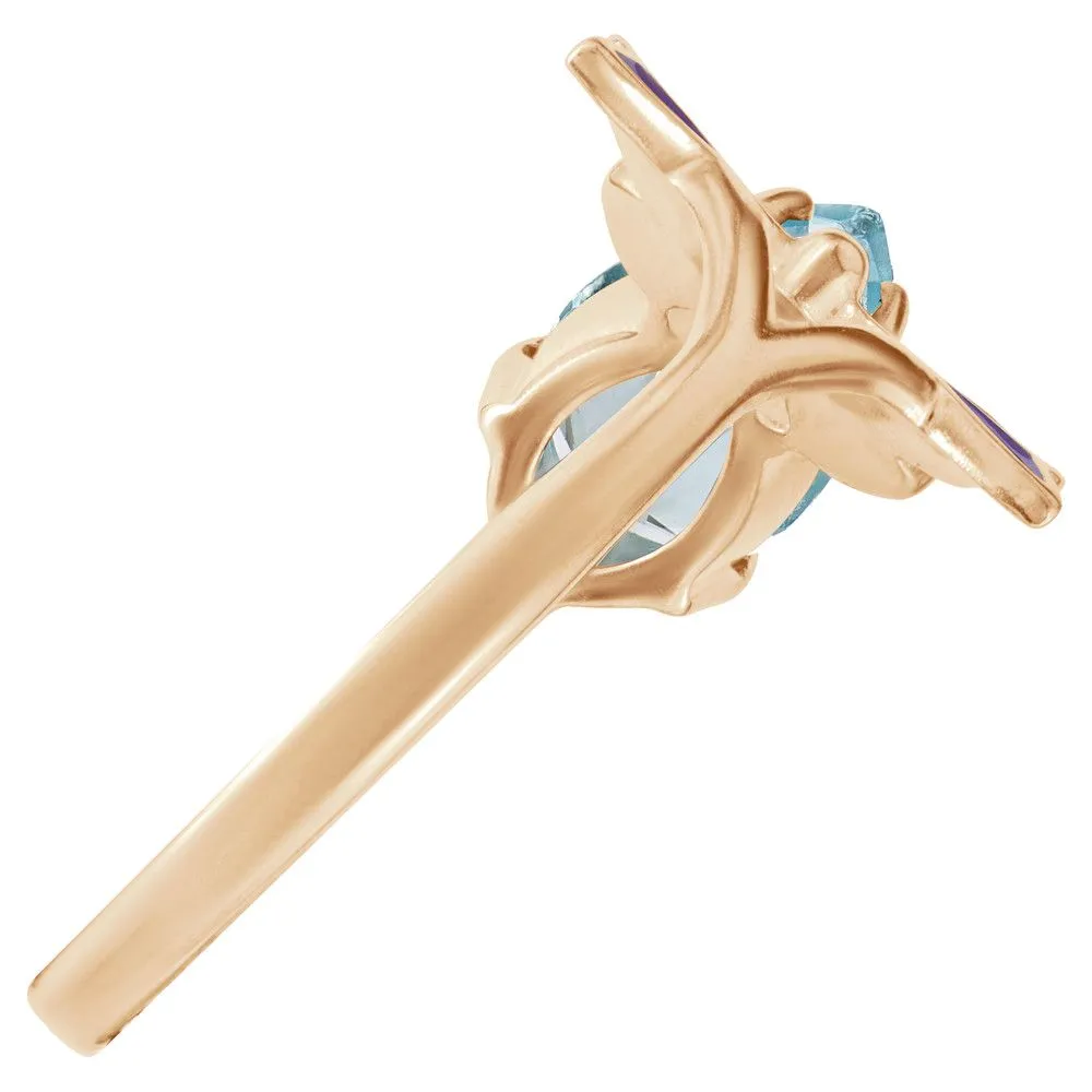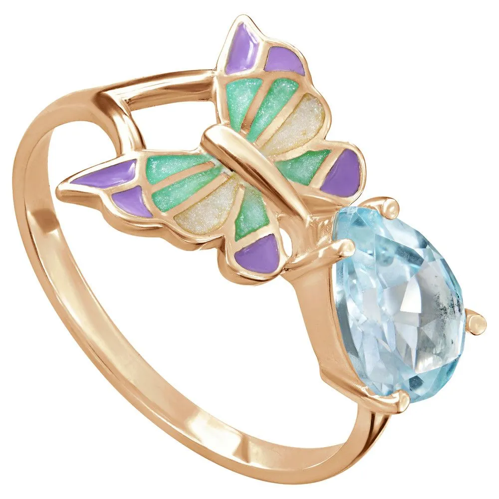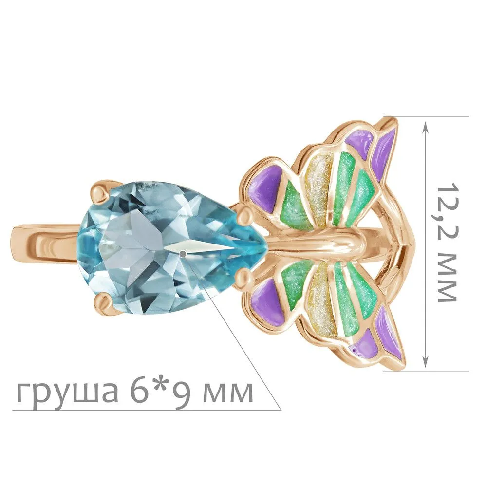 Серебряное кольцо с натуральным голубым топазом и эмалью - коллекция Бабочка, покрытие Розовое Золото. Средний вес украшения с камнями 2.35 гр. Месторождение: Топаз (Ильменские горы, Россия). Топаз (Натуральный) груша 6*9 мм., средний вес: 1.59 карат. Все изделия собственного производства и имеют гарантию 12 месяцев, к каждому изделию прилагается паспорт. Арт. 8450PG. Топаз – камень, который отличаются особенным блеском и многообразной гаммой. Сверхтвёрдый и сверхпрочный, он наделен и лечебными, и магическими свойствами. Считалось, что амулет из топаза способен благоприятно повлиять на зачатие, потому часто дарился бездетным парам. Это камень дружбы и благоразумия, радости, оптимизма и надежды.