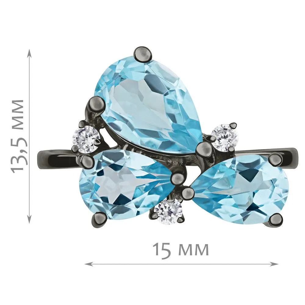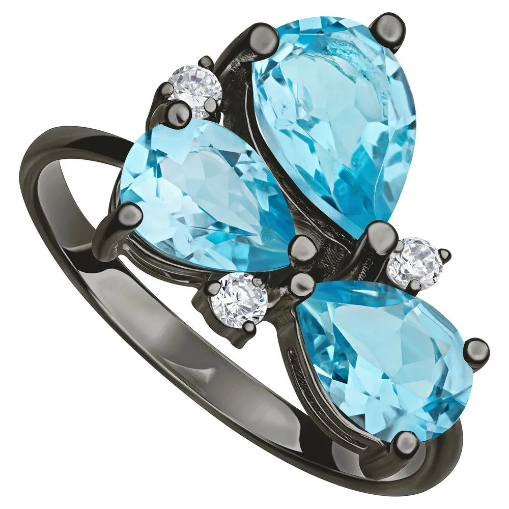 Серебряное кольцо с натуральным голубым топазом (Swiss) - коллекция Капель / покрытие Черный Родий. Средний вес украшения с камнями 3.09 гр. Месторождение: Топаз (Намибия) Ювелирные вставки: Топаз (Натуральный) груша 6*9 мм., средний вес: 1.45 карат. Топаз (Натуральный) груша 5*7 мм., средний вес: 0.78 карат. Все изделия собственного производства и имеют гарантию 12 месяцев. Арт. 8768BR. Топаз – камень, который отличаются особенным блеском и многообразной гаммой. Сверхтвёрдый и сверхпрочный, он наделен и лечебными, и магическими свойствами. Считалось, что амулет из топаза способен благоприятно повлиять на зачатие, потому часто дарился бездетным парам. Это камень дружбы и благоразумия, радости, оптимизма и надежды.