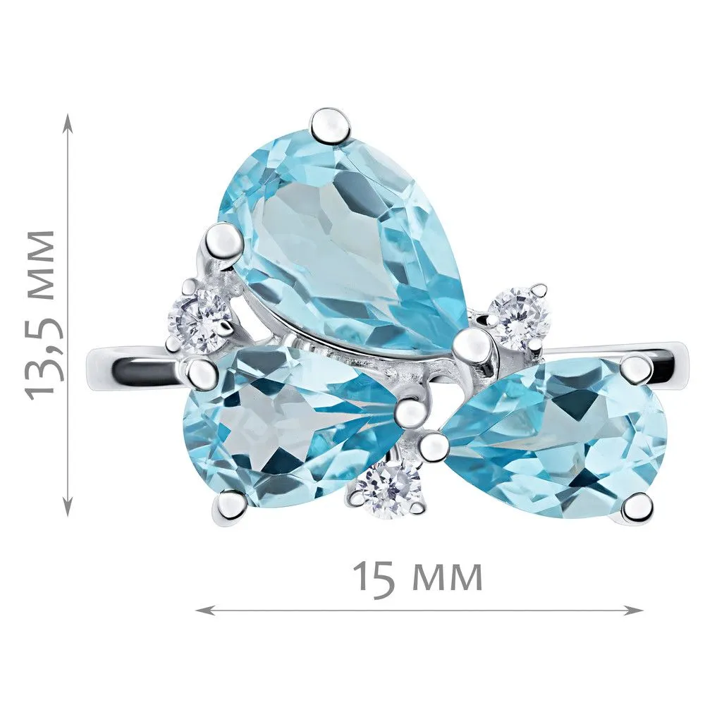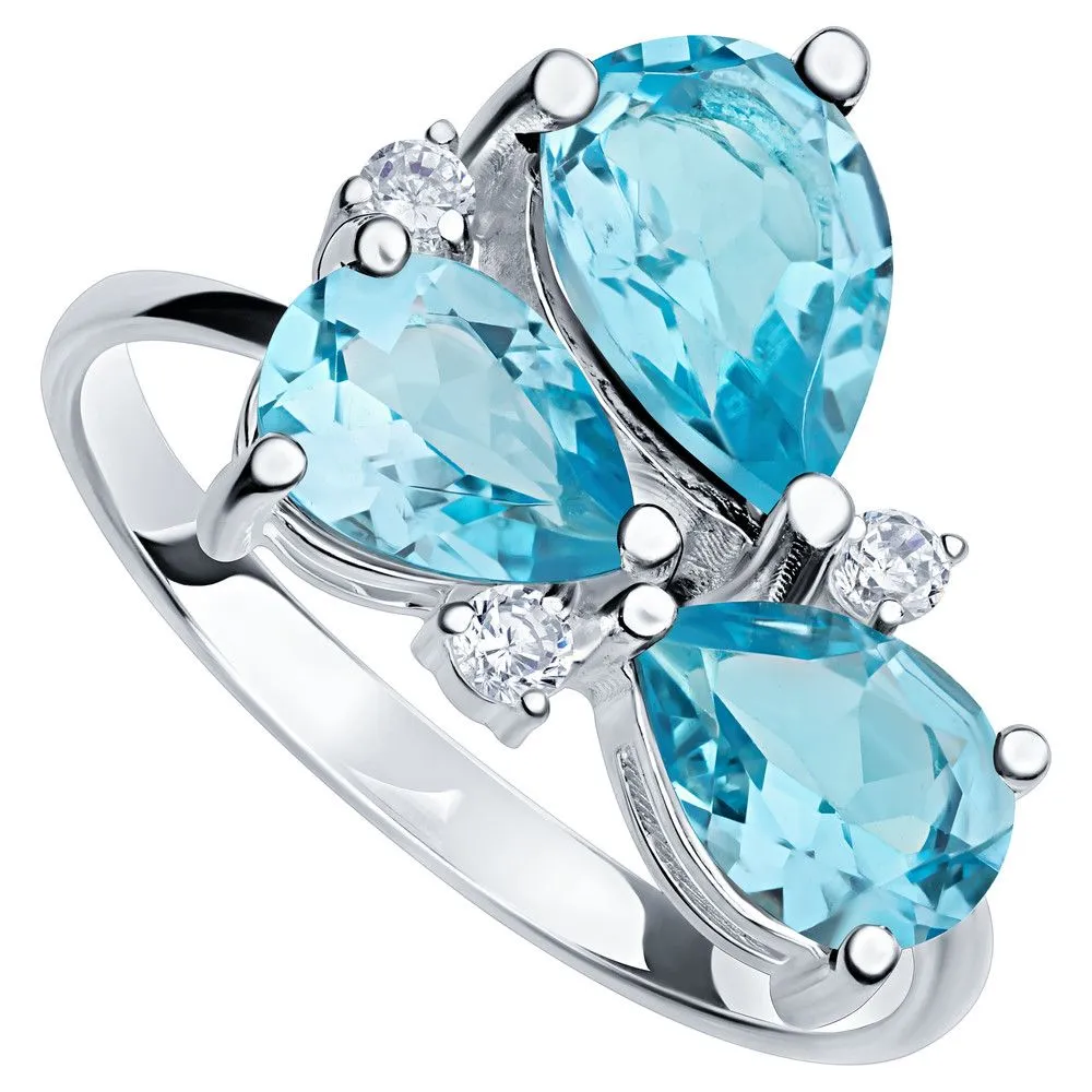 Серебряное кольцо с натуральным голубым топазом (Swiss) - коллекция Капель / Без покрытия. Средний вес украшения с камнями 3.07 гр. Месторождение: Топаз (Намибия) Ювелирные вставки: Топаз (Натуральный) груша 6*9 мм., средний вес: 1.45 карат. Топаз (Натуральный) груша 5*7 мм., средний вес: 0.78 карат. Все изделия собственного производства и имеют гарантию 12 месяцев. Арт. 8768NP. Топаз – камень, который отличаются особенным блеском и многообразной гаммой. Сверхтвёрдый и сверхпрочный, он наделен и лечебными, и магическими свойствами. Считалось, что амулет из топаза способен благоприятно повлиять на зачатие, потому часто дарился бездетным парам. Это камень дружбы и благоразумия, радости, оптимизма и надежды.