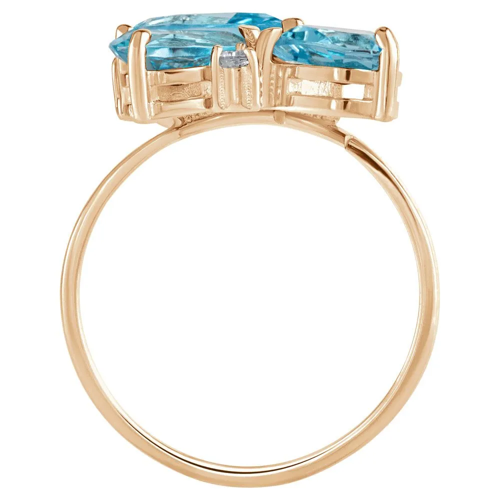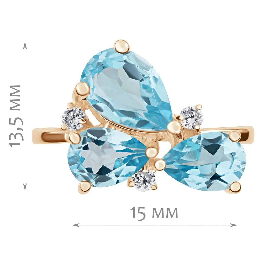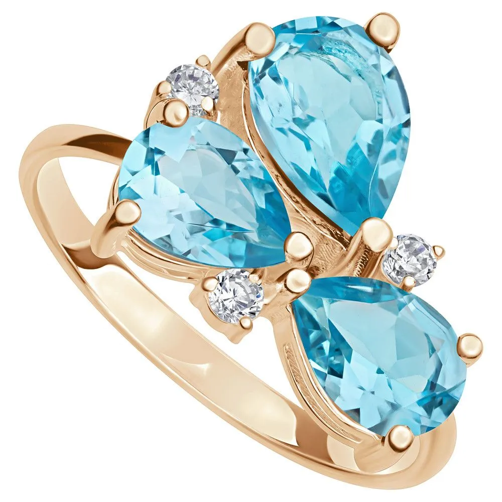 Серебряное кольцо с натуральным голубым топазом (Swiss) - коллекция Капель / покрытие Розовое Золото. Средний вес украшения с камнями 3.07 гр. Месторождение: Топаз (Намибия) Ювелирные вставки: Топаз (Натуральный) груша 6*9 мм., средний вес: 1.45 карат. Топаз (Натуральный) груша 5*7 мм., средний вес: 0.78 карат. Все изделия собственного производства и имеют гарантию 12 месяцев. Арт. 8768PG. Топаз – камень, который отличаются особенным блеском и многообразной гаммой. Сверхтвёрдый и сверхпрочный, он наделен и лечебными, и магическими свойствами. Считалось, что амулет из топаза способен благоприятно повлиять на зачатие, потому часто дарился бездетным парам. Это камень дружбы и благоразумия, радости, оптимизма и надежды.