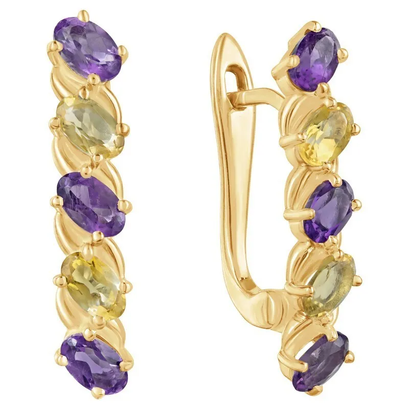 Серебряные серьги с натуральными камнями аметист и цитрин - коллекция Колосок. Серебряные серьги 925 пробы с покрытием желтое золото. Цвет покрытия соответствует швейцарскому цветовому стандарту NIHS -FF24ct и цвету чистого золото 999.99. На последней фотографии мы разместили сравнительную фотографию 3 цвета золотого покрытия. Помимо предания золотого цвета Вашему изделию, тонкий слой золота защищает от окисления. Для более стойкого эффекта золочения и долговечности покрытия мы дополнительно наносим подслой палладия (Pd). Средний вес изделия с камнями 4.25 гр. Месторождения: Аметист (Приполярный Урал, Россия) и Цитрин (Урал, Россия) Аметист (Натуральный) овал 3*5 мм., средний вес: 0.26 карат. Цитрин (Натуральный) овал 3*5 мм., средний вес: 0.24 карат. Все изделия собственного производства. Гарантия 12 месяцев.Арт. 8020.