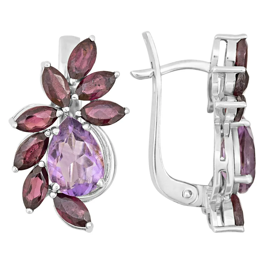 Серебряные серьги "Элегия" с натуральными камнями аметист и гранат, покрытие Черный Родий. Средний вес украшения с камнями 6,99 гр. Месторождение(я) камней: Аметист (Приполярный Урал, Россия), Гранат (Кольский п-ов, Россия). Аметист (Натуральный) груша: 7*10 мм., средний вес 1,77 карат. Гранат (Натуральный) маркиз: 3*6 мм., средний вес 0,35 карат. Размер лицевой части: 15*24 мм. Все изделия собственного производства и имеют гарантию 12 месяцев, к каждому изделию прилагается паспорт. Арт. 6664BR