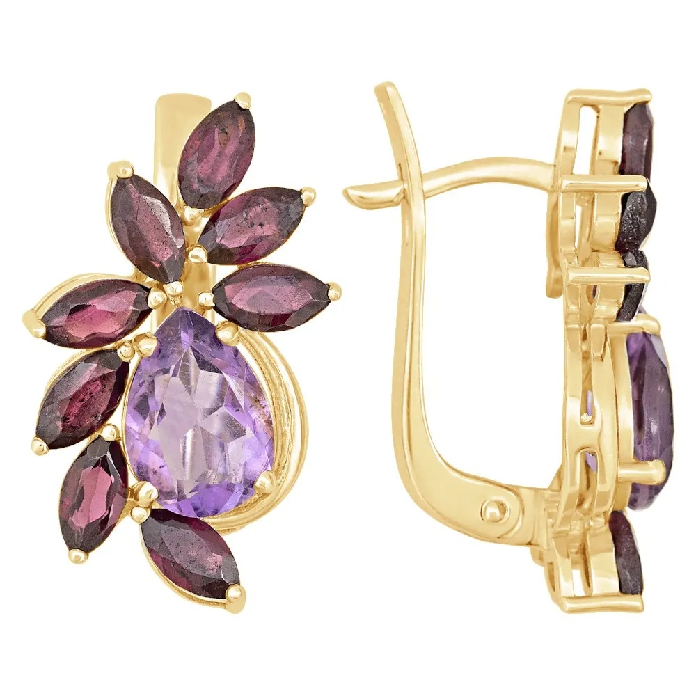 Серебряные серьги "Элегия" с натуральными камнями аметист и гранат, покрытие Желтое Золото. Средний вес украшения с камнями 6,99 гр. Месторождение(я) камней: Аметист (Приполярный Урал, Россия), Гранат (Кольский п-ов, Россия). Аметист (Натуральный) груша: 7*10 мм., средний вес 1,77 карат. Гранат (Натуральный) маркиз: 3*6 мм., средний вес 0,35 карат. Размер лицевой части: 15*24 мм. Все изделия собственного производства и имеют гарантию 12 месяцев, к каждому изделию прилагается паспорт. Арт. 6664YG