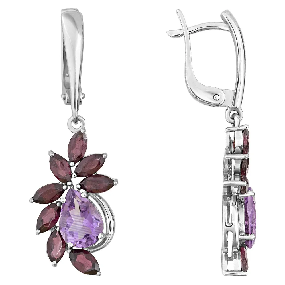 Серебряные серьги "Элегия" с натуральными камнями аметист и гранат, покрытие Белый Родий. Средний вес украшения с камнями 7,53 гр. Месторождение(я) камней: Аметист (Приполярный Урал, Россия), Гранат (Кольский п-ов, Россия). Аметист (Натуральный) груша: 7*10 мм., средний вес: 1,77 карат. Гранат (Натуральный) маркиз: 3*6 мм., средний вес 0,35 карат. Размер лицевой части: 15*43 мм. Все изделия собственного производства и имеют гарантию 12 месяцев, к каждому изделию прилагается паспорт. Арт. 6665WR