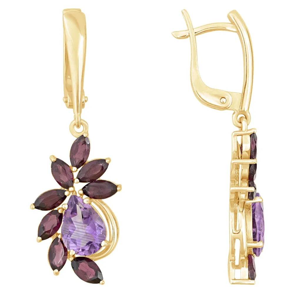 Серебряные серьги "Элегия" с натуральными камнями аметист и гранат, покрытие Желтое Золото. Средний вес украшения с камнями 7,53 гр. Месторождение(я) камней: Аметист (Приполярный Урал, Россия), Гранат (Кольский п-ов, Россия). Аметист (Натуральный) груша: 7*10 мм., средний вес: 1,77 карат. Гранат (Натуральный) маркиз: 3*6 мм., средний вес 0,35 карат. Размер лицевой части: 15*43 мм. Все изделия собственного производства и имеют гарантию 12 месяцев, к каждому изделию прилагается паспорт. Арт. 6665YG