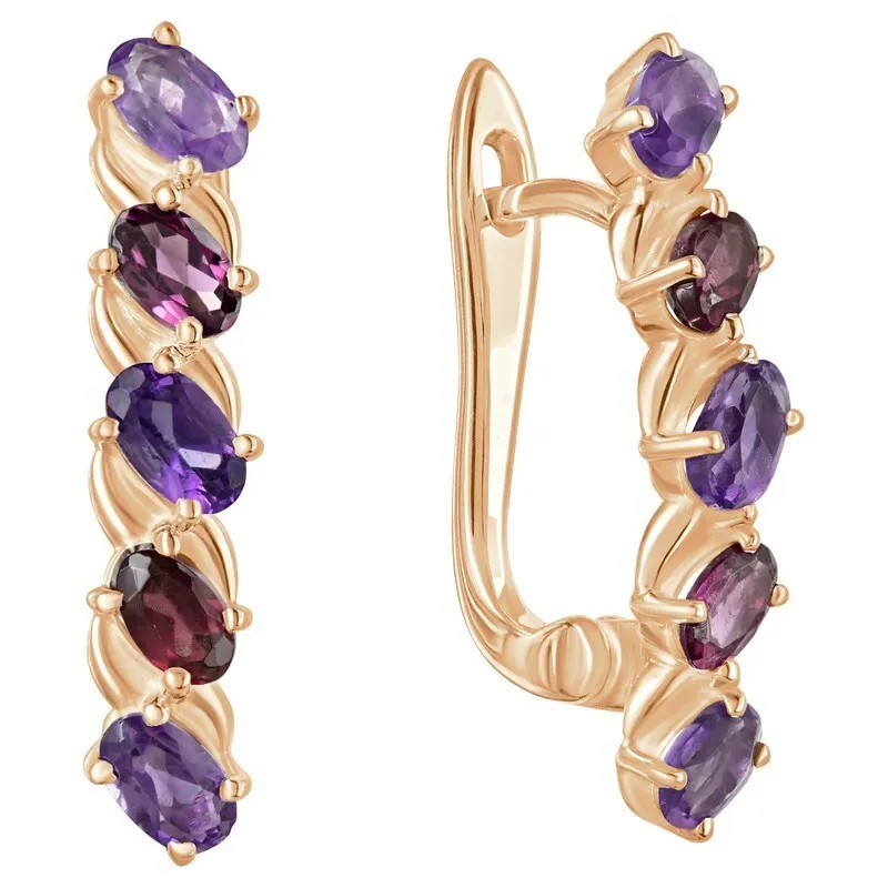 Серебряные серьги с натуральными камнями аметист и гранат - коллекция Колосок. Серебряные серьги 925 пробы с покрытием розовое золото. Цвет покрытия соответствует швейцарскому цветовому стандарту NIHS -4N и цвету розового золота 585 в России. На последней фотографии мы разместили сравнительную фотографию 3 цвета золотого покрытия. Помимо предания золотого цвета Вашему изделию, тонкий слой золота защищает от окисления. Для более стойкого эффекта золочения и долговечности покрытия мы дополнительно наносим подслой палладия (Pd). Средний вес изделия с камнями 4.27 гр. Месторождения: Аметист (Приполярный Урал, Россия) и Гранат (Кольский п-ов, Россия) Аметист (Натуральный) овал 3*5 мм., средний вес: 0.26 карат. Гранат (Натуральный) овал 3*5 мм., средний вес: 0.34 карат. Все изделия собственного производства. Гарантия 12 месяцев.Арт. 8024. Гранат называют камнем любви. Он дарит своим обладательницам мудрость, а владельцам – решительность и храбрость. Данному камню присущи лечебные свойства, давным-давно он использовался при ранениях. Считалось, что он помогает поддерживать связь с миром мертвых.