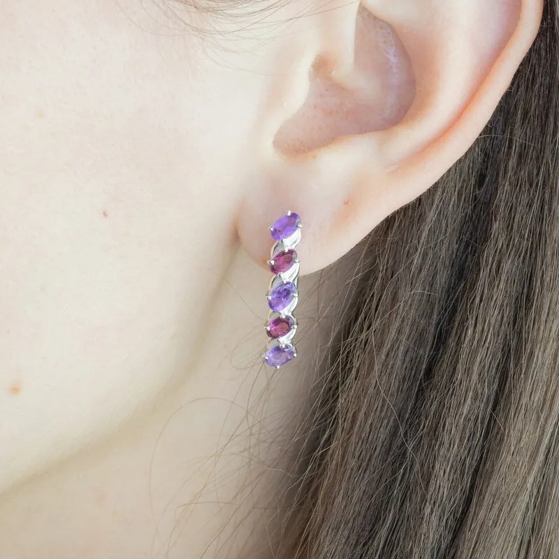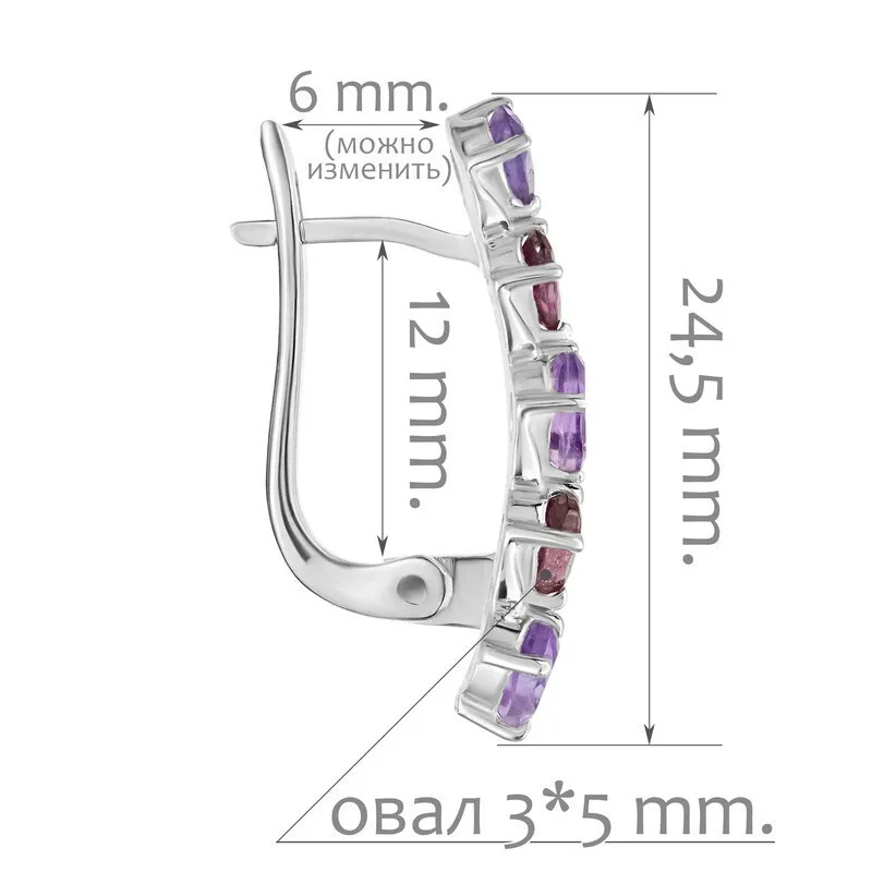 Серебряные серьги с натуральными камнями аметист и гранат - коллекция Колосок. Средний вес изделия с камнями 4.27 гр. Месторождения: Аметист (Приполярный Урал, Россия) и Гранат (Кольский п-ов, Россия) Аметист (Натуральный) овал 3*5 мм., средний вес: 0.26 карат. Гранат (Натуральный) овал 3*5 мм., средний вес: 0.34 карат. Все изделия собственного производства. Гарантия 12 месяцев.Арт. 8024. Гранат называют камнем любви. Он дарит своим обладательницам мудрость, а владельцам – решительность и храбрость. Данному камню присущи лечебные свойства, давным-давно он использовался при ранениях. Считалось, что он помогает поддерживать связь с миром мертвых.