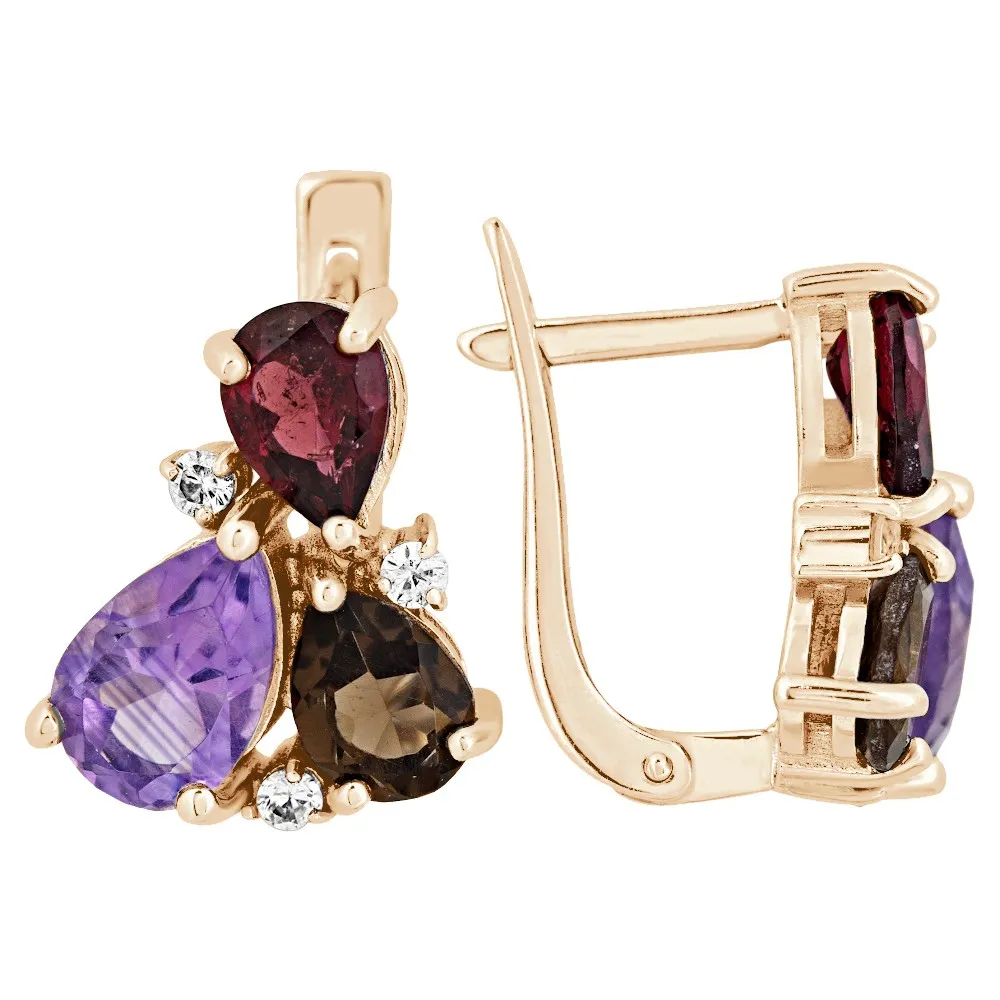 Серебряные серьги "Капель" с натуральными камнями аметист (светлый), гранат и раухтопаз, покрытие Розовое Золото. Средний вес украшения с камнями 5,62 гр. Месторождение(я) камней: Аметист (Приполярный Урал, Россия), Гранат (Кольский п-ов, Россия), Раухтопаз (Дымчатый кварц) (м-ние Додо ХМАО, Россия). Аметист (Натуральный) груша: 6*9 мм., средний вес 1,00 карат. Раухтопаз (Натуральный) груша: 5*7 мм., средний вес 0,70 карат. Гранат (Натуральный) груша: 5*7 мм., средний вес 0,75 карат. Циркон белый (Натуральный) круг: 2 мм., средний вес 0,05 карат.