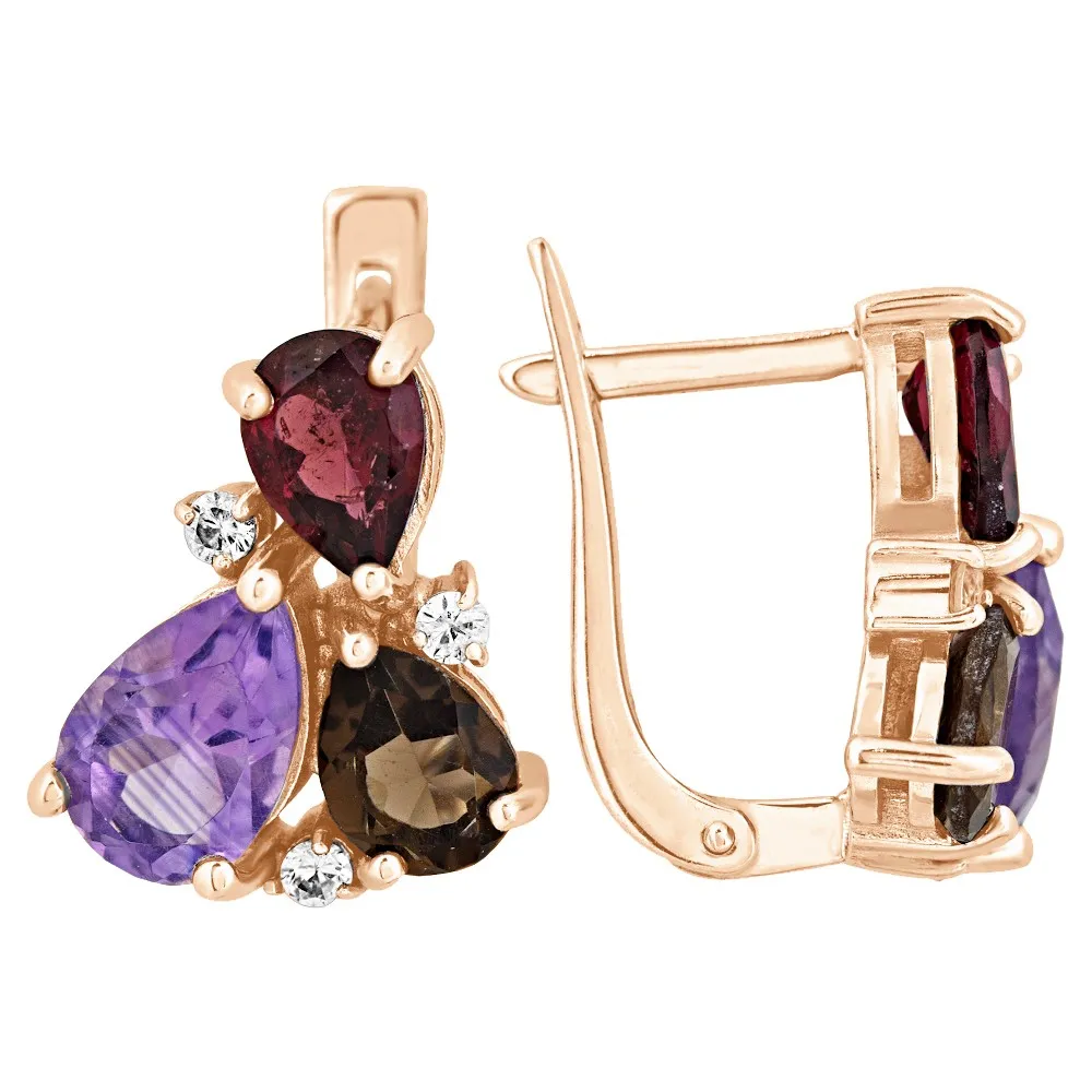 Серебряные серьги "Капель" с натуральными камнями аметист (светлый), гранат и раухтопаз, покрытие Красное Золото. Средний вес украшения с камнями 5,62 гр. Месторождение(я) камней: Аметист (Приполярный Урал, Россия), Гранат (Кольский п-ов, Россия), Раухтопаз (Дымчатый кварц) (м-ние Додо ХМАО, Россия). Аметист (Натуральный) груша: 6*9 мм., средний вес 1,00 карат. Раухтопаз (Натуральный) груша: 5*7 мм., средний вес 0,70 карат. Гранат (Натуральный) груша: 5*7 мм., средний вес 0,75 карат. Циркон белый (Натуральный) круг: 2 мм., средний вес 0,05 карат.