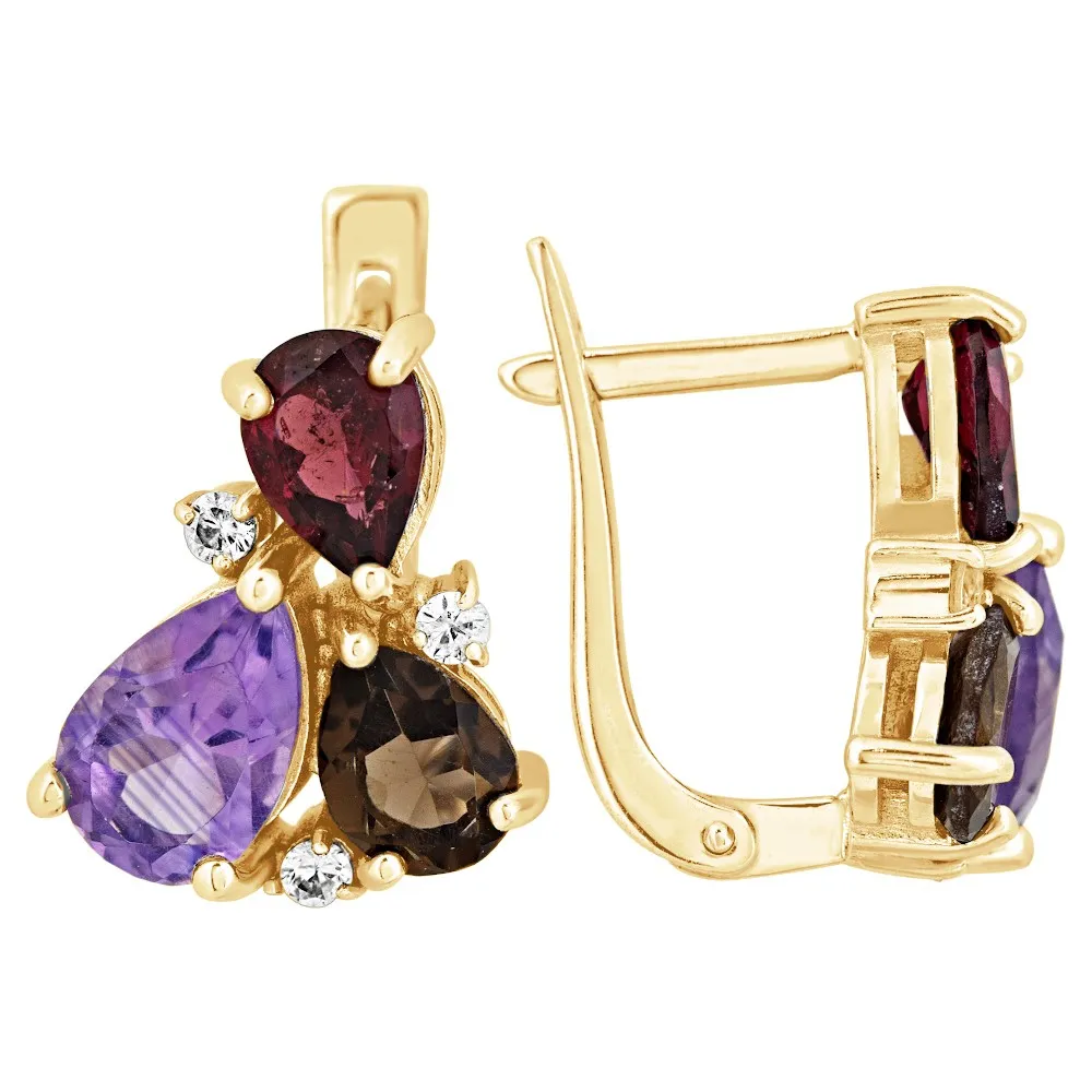 Серебряные серьги "Капель" с натуральными камнями аметист (светлый), гранат и раухтопаз, покрытие Желтое Золото. Средний вес украшения с камнями 5,62 гр. Месторождение(я) камней: Аметист (Приполярный Урал, Россия), Гранат (Кольский п-ов, Россия), Раухтопаз (Дымчатый кварц) (м-ние Додо ХМАО, Россия). Аметист (Натуральный) груша: 6*9 мм., средний вес 1,00 карат. Раухтопаз (Натуральный) груша: 5*7 мм., средний вес 0,70 карат. Гранат (Натуральный) груша: 5*7 мм., средний вес 0,75 карат. Циркон белый (Натуральный) круг: 2 мм., средний вес 0,05 карат.