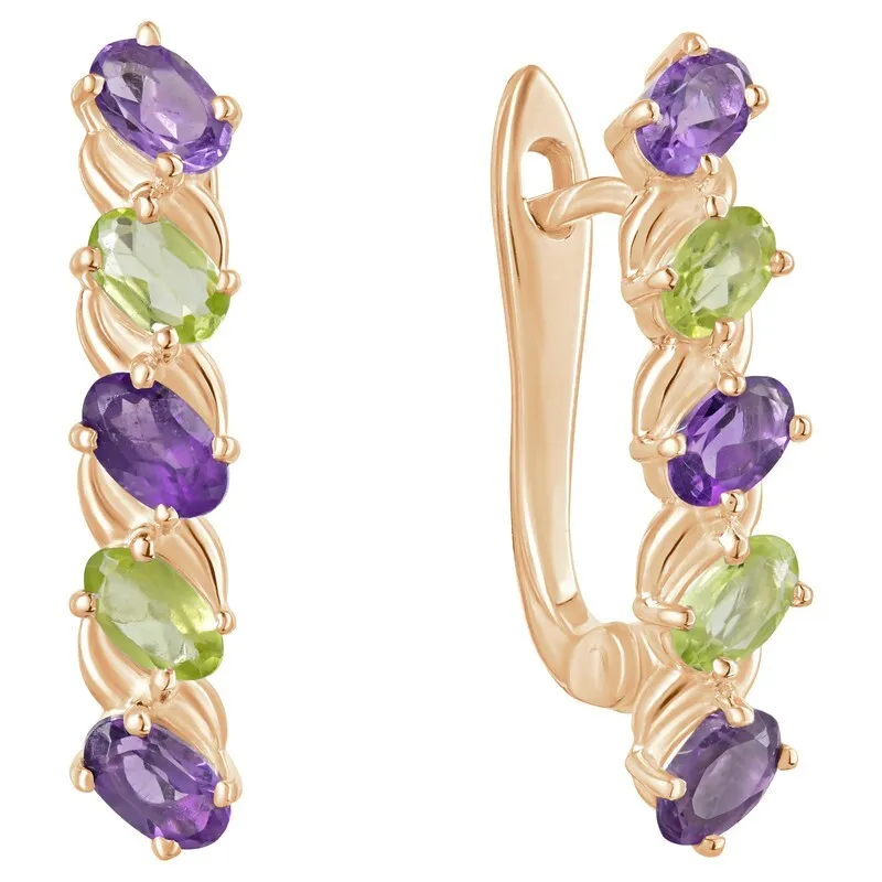 Серебряные серьги с натуральными камнями аметист и хризолит - коллекция Колосок. Серебряные серьги 925 пробы с покрытием розовое золото. Цвет покрытия соответствует швейцарскому цветовому стандарту NIHS -4N и цвету розового золота 585 в России. На последней фотографии мы разместили сравнительную фотографию 3 цвета золотого покрытия. Помимо предания золотого цвета Вашему изделию, тонкий слой золота защищает от окисления. Для более стойкого эффекта золочения и долговечности покрытия мы дополнительно наносим подслой палладия (Pd). Средний вес изделия с камнями 4.26 гр. Месторождения: Аметист (Приполярный Урал, Россия) и Хризолит (Якутия, Россия) Аметист (Натуральный) овал 3*5 мм., средний вес: 0.26 карат. Хризолит (Натуральный) овал 3*5 мм., средний вес: 0.25 карат. Все изделия собственного производства. Гарантия 12 месяцев.Арт. 8019.