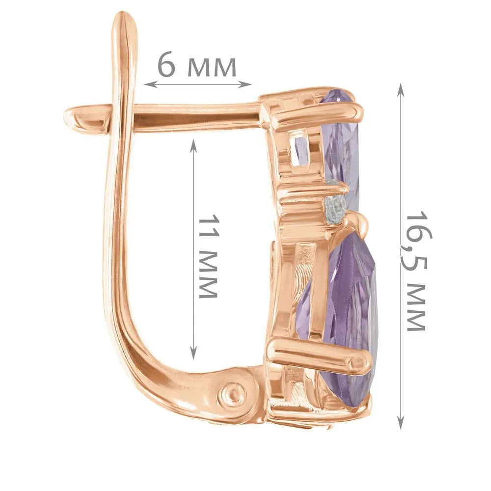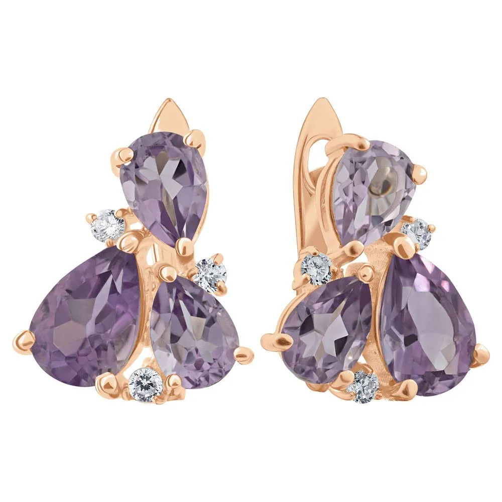 Серебряные серьги Капель с натуральным аметистом, покрытие Красное Золото. Средний вес украшения с камнями 5,62 гр. Месторождение(я) камней: Аметист (Приполярный Урал, Россия). Аметист (Натуральный) груша: 6*9 мм., средний вес 1,00 карат. Аметист (Натуральный) груша: 5*7 мм., средний вес 0,80 карат. Циркон белый (Натуральный) круг: 2 мм., средний вес 0,05 карат. Размер лицевой части: 13*15 мм. Все изделия собственного производства и имеют гарантию 12 месяцев. Арт. 6684RG . Аметист — прозрачный или полупрозрачный камень фиолетовых оттенков, подвид кварца. Он гармонизирует разум, снимает стресс, улучшает кровообращение, способствует умственному развитию и личностному росту. Считается, что он также оберегает от головной боли и бессонницы, служит противоядием, помогает избавиться от алкоголизма и наделяет владельца проницательностью, раскрывая «третий глаз» (за который отвечает чакра аджна). В медитации помогает расслабиться и успокоиться. Положенный под подушку, аметист приносит хорошие сны.