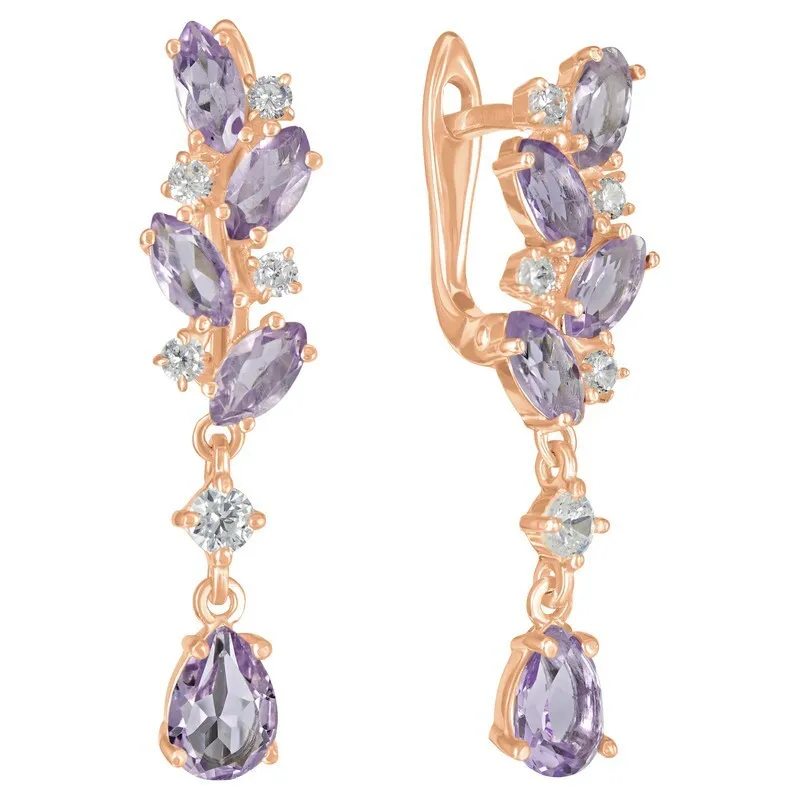 Серебряные серьги с натуральным аметистом - коллекция Росинка. Серебряные серьги 925 пробы с покрытием красное золото. Цвет покрытия соответствует швейцарскому цветовому стандарту NIHS -5N и цвету красного золота 585 в России. На последней фотографии мы разместили сравнительную фотографию 3 цвета золотого покрытия. Помимо предания золотого цвета Вашему изделию, тонкий слой золота защищает от окисления. Для более стойкого эффекта золочения и долговечности покрытия мы дополнительно наносим подслой палладия (Pd). Средний вес изделия с камнями 4.29 гр. Месторождение: Аметист (Приполярный Урал, Россия). Аметист (Натуральный) груша 5*7 мм., средний вес: 0.65 карат. Все изделия собственного производства. Гарантия 12 месяцев.Арт. 8418.