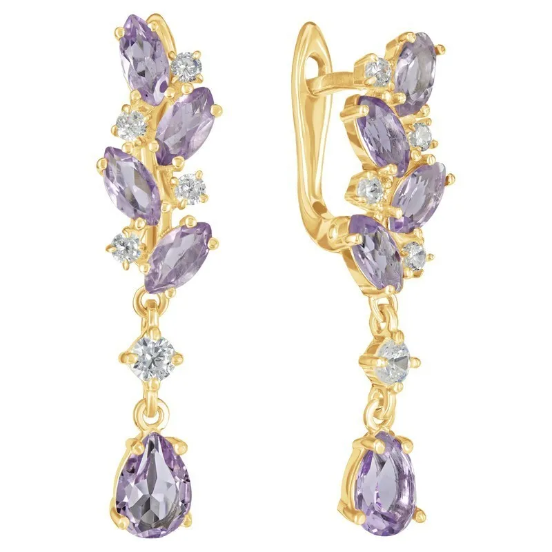 Серебряные серьги с натуральным аметистом - коллекция Росинка. Серебряные серьги 925 пробы с покрытием желтое золото. Цвет покрытия соответствует швейцарскому цветовому стандарту NIHS -FF24ct и цвету чистого золото 999.99. На последней фотографии мы разместили сравнительную фотографию 3 цвета золотого покрытия. Помимо предания золотого цвета Вашему изделию, тонкий слой золота защищает от окисления. Для более стойкого эффекта золочения и долговечности покрытия мы дополнительно наносим подслой палладия (Pd). Средний вес изделия с камнями 4.29 гр. Месторождение: Аметист (Приполярный Урал, Россия). Аметист (Натуральный) груша 5*7 мм., средний вес: 0.65 карат. Все изделия собственного производства. Гарантия 12 месяцев.Арт. 8418.