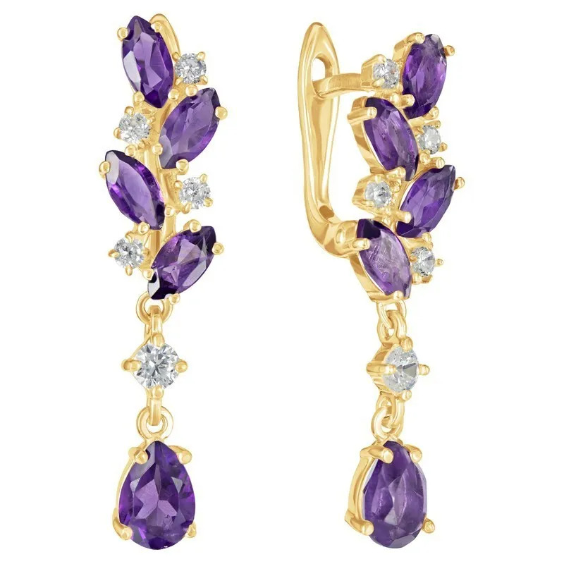 Серебряные серьги с натуральным аметистом - коллекция Росинка. Серебряные серьги 925 пробы с покрытием желтое золото. Цвет покрытия соответствует швейцарскому цветовому стандарту NIHS -FF24ct и цвету чистого золото 999.99. На последней фотографии мы разместили сравнительную фотографию 3 цвета золотого покрытия. Помимо предания золотого цвета Вашему изделию, тонкий слой золота защищает от окисления. Для более стойкого эффекта золочения и долговечности покрытия мы дополнительно наносим подслой палладия (Pd). Средний вес изделия с камнями 4.36 гр. Месторождение: Аметист (Приполярный Урал, Россия). Аметист (Натуральный) груша 5*7 мм., средний вес: 0.65 карат. Все изделия собственного производства. Гарантия 12 месяцев.Арт. 8419.