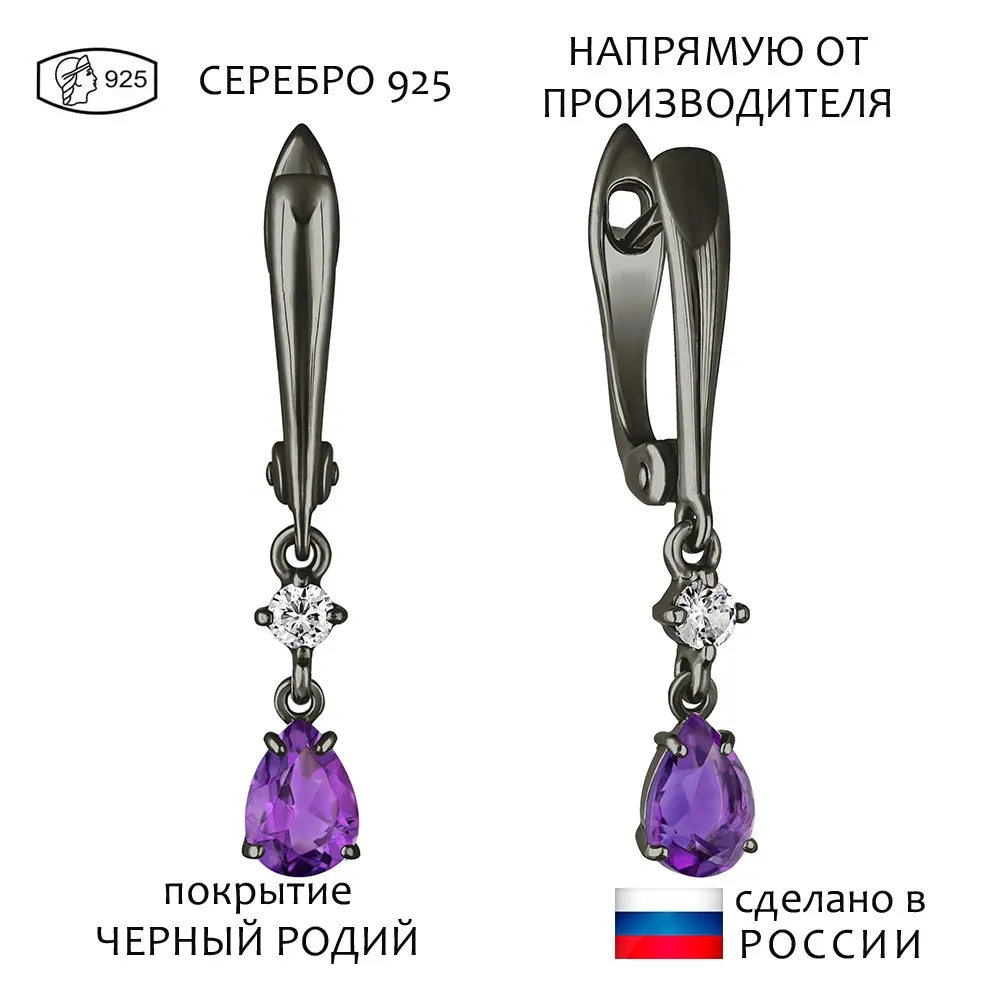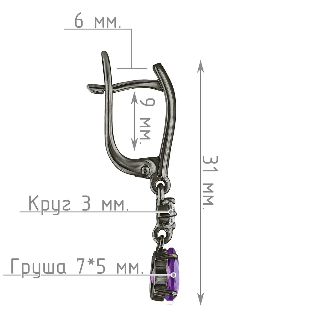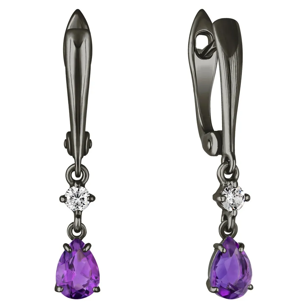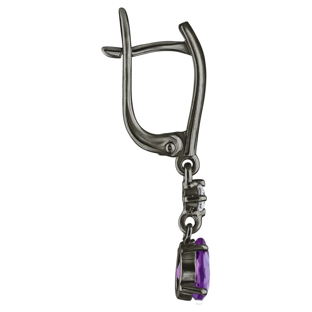 Серебряные серьги с натуральным аметистом (темным) - коллекция Алсу (малая) / Черный Родий.