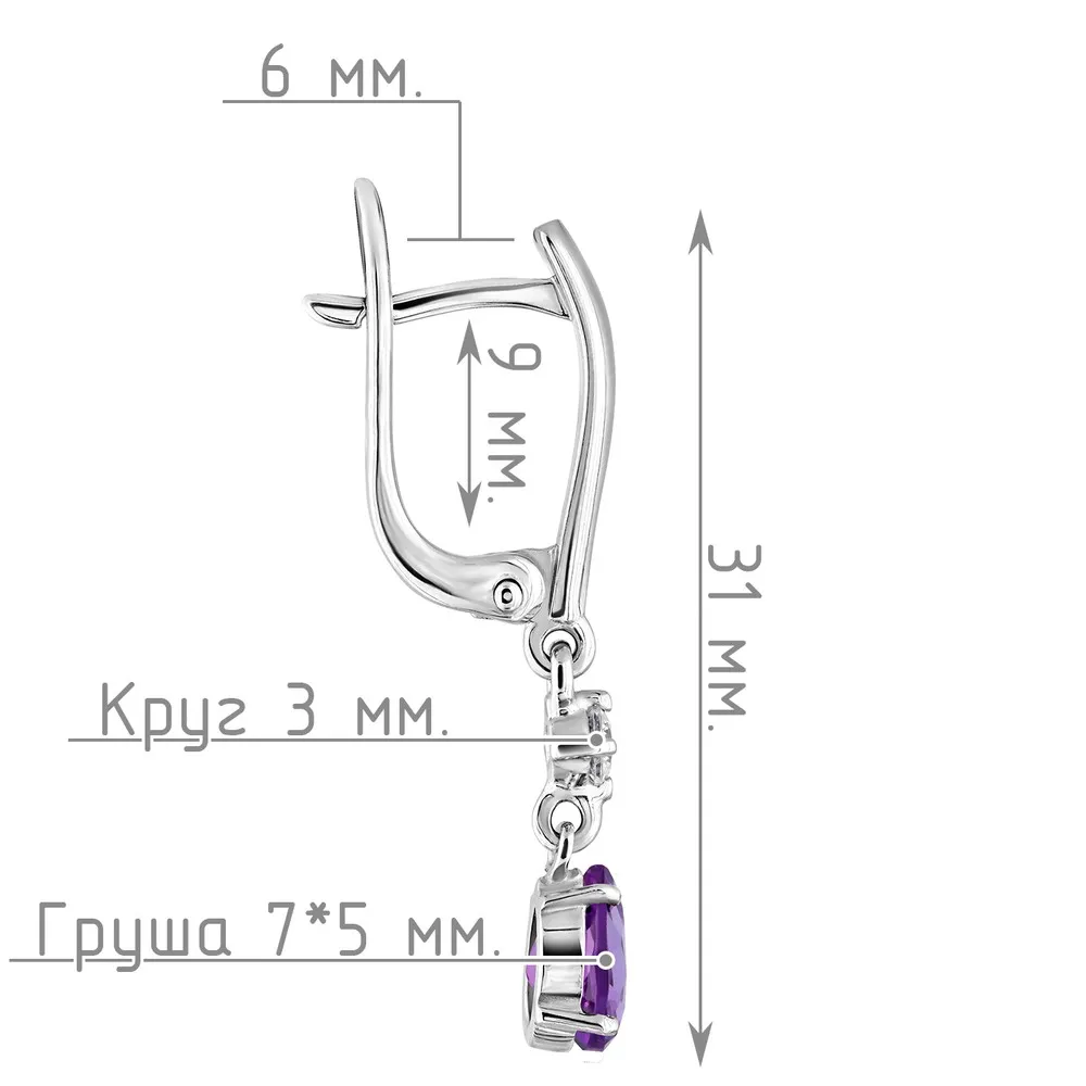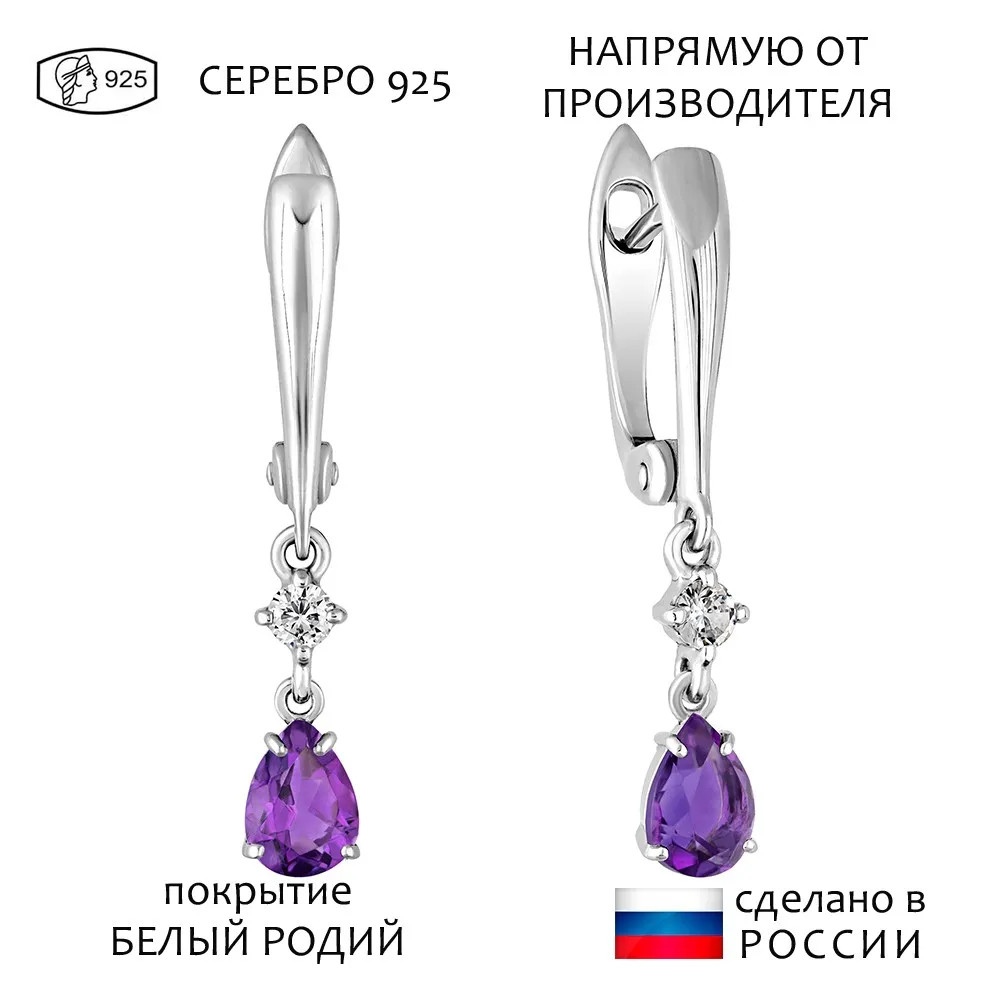 Серебряные серьги с натуральным аметистом (темным) - коллекция Алсу (малая) / Белый Родий.