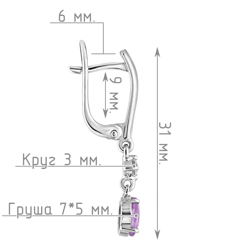 Серебряные серьги с натуральным аметистом (светлым) - коллекция Алсу (малая) / Белый Родий.