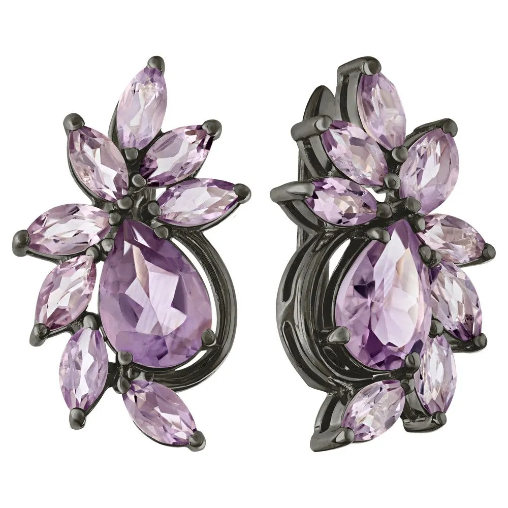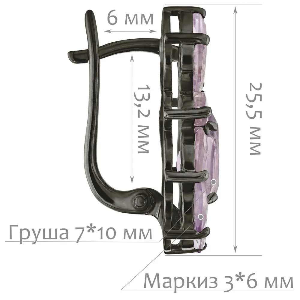 Серебряные серьги Элегия с натуральным аметистом, покрытие Черный Родий. Средний вес украшения с камнями 6,99 гр. Месторождение(я) камней: Аметист (Приполярный Урал, Россия). Аметист (Натуральный) груша: 7*10 мм., средний вес: 1,77 карат. Аметист (Натуральный) маркиз: 3*6 мм., средний вес: 0,22 карат. Размер лицевой части: 15*24 мм. Все изделия собственного производства и имеют гарантию 12 месяцев. Арт. 6656. BR . Аметист — прозрачный или полупрозрачный камень фиолетовых оттенков, подвид кварца. Он гармонизирует разум, снимает стресс, улучшает кровообращение, способствует умственному развитию и личностному росту. Считается, что он также оберегает от головной боли и бессонницы, служит противоядием, помогает избавиться от алкоголизма и наделяет владельца проницательностью, раскрывая «третий глаз» (за который отвечает чакра аджна). В медитации помогает расслабиться и успокоиться. Положенный под подушку, аметист приносит хорошие сны.