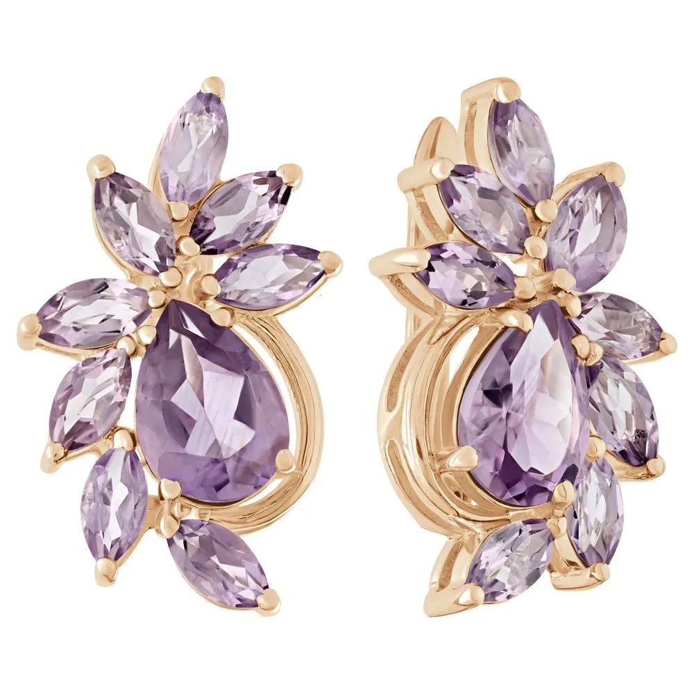 Серебряные серьги Элегия с натуральным аметистом, покрытие Розовое Золото. Средний вес украшения с камнями 6,99 гр. Месторождение(я) камней: Аметист (Приполярный Урал, Россия). Аметист (Натуральный) груша: 7*10 мм., средний вес: 1,77 карат. Аметист (Натуральный) маркиз: 3*6 мм., средний вес: 0,22 карат. Размер лицевой части: 15*24 мм. Все изделия собственного производства и имеют гарантию 12 месяцев. Арт. 6656. PG . Аметист — прозрачный или полупрозрачный камень фиолетовых оттенков, подвид кварца. Он гармонизирует разум, снимает стресс, улучшает кровообращение, способствует умственному развитию и личностному росту. Считается, что он также оберегает от головной боли и бессонницы, служит противоядием, помогает избавиться от алкоголизма и наделяет владельца проницательностью, раскрывая «третий глаз» (за который отвечает чакра аджна). В медитации помогает расслабиться и успокоиться. Положенный под подушку, аметист приносит хорошие сны.