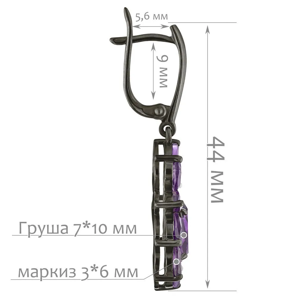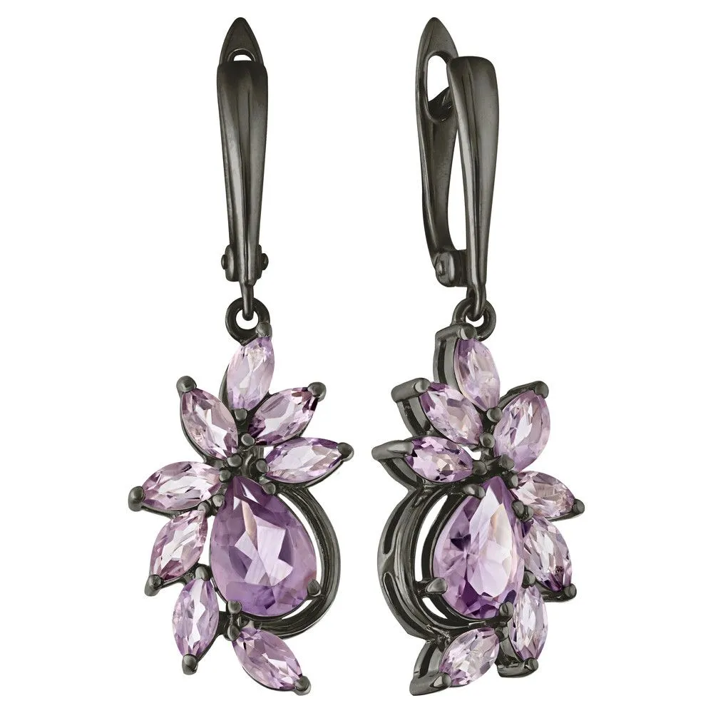 Серебряные серьги Элегия с натуральным аметистом. Месторождение(я) камней: Аметист (Приполярный Урал, Россия), покрытие Черный Родий. Средний вес украшения с камнями 7,53 гр. Аметист (Натуральный) груша: 7*10 мм., средний вес: 1,77 карат. Аметист (Натуральный) маркиз: 3*6 мм., средний вес: 0,22 карат. Размер лицевой части: 15*43 мм. Все изделия собственного производства и имеют гарантию 12 месяцев. Арт. 6657BR . Аметист — прозрачный или полупрозрачный камень фиолетовых оттенков, подвид кварца. Он гармонизирует разум, снимает стресс, улучшает кровообращение, способствует умственному развитию и личностному росту. Считается, что он также оберегает от головной боли и бессонницы, служит противоядием, помогает избавиться от алкоголизма и наделяет владельца проницательностью, раскрывая «третий глаз» (за который отвечает чакра аджна). В медитации помогает расслабиться и успокоиться. Положенный под подушку, аметист приносит хорошие сны.