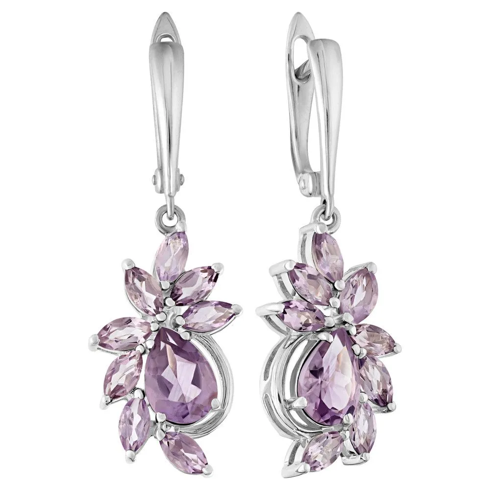 Серебряные серьги Элегия с натуральным аметистом. Месторождение(я) камней: Аметист (Приполярный Урал, Россия), покрытие Белый Родий. Средний вес украшения с камнями 7,53 гр. Аметист (Натуральный) груша: 7*10 мм., средний вес: 1,77 карат. Аметист (Натуральный) маркиз: 3*6 мм., средний вес: 0,22 карат. Размер лицевой части: 15*43 мм. Все изделия собственного производства и имеют гарантию 12 месяцев. Арт. 6657WR . Аметист — прозрачный или полупрозрачный камень фиолетовых оттенков, подвид кварца. Он гармонизирует разум, снимает стресс, улучшает кровообращение, способствует умственному развитию и личностному росту. Считается, что он также оберегает от головной боли и бессонницы, служит противоядием, помогает избавиться от алкоголизма и наделяет владельца проницательностью, раскрывая «третий глаз» (за который отвечает чакра аджна). В медитации помогает расслабиться и успокоиться. Положенный под подушку, аметист приносит хорошие сны.