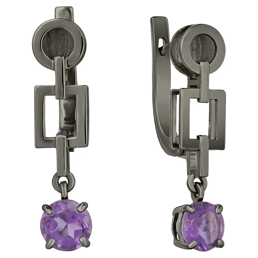 Серебряные серьги "Классик" с натуральным аметистом, покрытие Черный Родий.