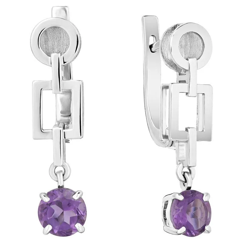 Серебряные серьги с натуральным аметистом (светлым) - коллекция Классик / покрытие Белый Родий