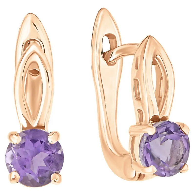 Серебряные серьги с натуральным аметистом - коллекция Мона. Серебряные серьги 925 пробы с покрытием красное золото. Цвет покрытия соответствует швейцарскому цветовому стандарту NIHS -5N и цвету красного золота 585 в России. На последней фотографии мы разместили сравнительную фотографию 3 цвета золотого покрытия. Помимо предания золотого цвета Вашему изделию, тонкий слой золота защищает от окисления. Для более стойкого эффекта золочения и долговечности покрытия мы дополнительно наносим подслой палладия (Pd). Средний вес изделия с камнем составляет 2.59 гр. Месторождение(я): Аметист (Приполярный Урал, Россия). Аметист (Натуральный) круг 5 мм., средний вес: 0.49 карат. Все изделия собственного производства. Гарантия 12 месяцев.Арт. 7714. Аметист — прозрачный или полупрозрачный камень фиолетовых оттенков, подвид кварца. Он гармонизирует разум, снимает стресс, улучшает кровообращение, способствует умственному развитию и личностному росту. Считается, что он также оберегает от головной боли и бессонницы, служит противоядием, помогает избавиться от алкоголизма и наделяет владельца проницательностью, раскрывая «третий глаз» (за который отвечает чакра аджна). В медитации помогает расслабиться и успокоиться. Положенный под подушку, аметист приносит хорошие сны.