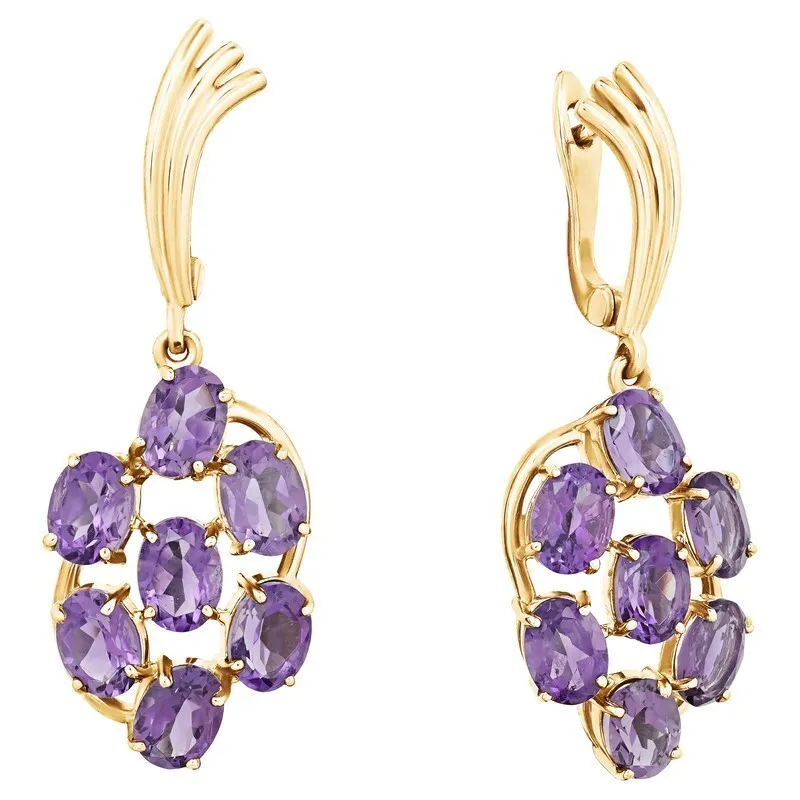 Серебряные серьги с натуральным аметистом - коллекция Аэлита. Серебряные серьги 925 пробы с покрытием желтое золото. Цвет покрытия соответствует швейцарскому цветовому стандарту NIHS -FF24ct и цвету чистого золото 999.99. На последней фотографии мы разместили сравнительную фотографию 3 цвета золотого покрытия. Помимо предания золотого цвета Вашему изделию, тонкий слой золота защищает от окисления. Для более стойкого эффекта золочения и долговечности покрытия мы дополнительно наносим подслой палладия (Pd). Средний вес изделия с камнями 9.85 гр. Месторождение: Аметист (Приполярный Урал, Россия). Аметист (Натуральный) овал 5*7 мм., средний вес: 0.81 карат. Все изделия собственного производства. Гарантия 12 месяцев.Арт. 7821. Аметист — прозрачный или полупрозрачный камень фиолетовых оттенков, подвид кварца. Он гармонизирует разум, снимает стресс, улучшает кровообращение, способствует умственному развитию и личностному росту. Считается, что он также оберегает от головной боли и бессонницы, служит противоядием, помогает избавиться от алкоголизма и наделяет владельца проницательностью, раскрывая «третий глаз» (за который отвечает чакра аджна). В медитации помогает расслабиться и успокоиться. Положенный под подушку, аметист приносит хорошие сны.