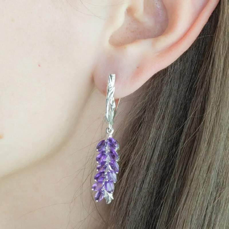 Серебряные серьги с натуральным аметистом - коллекция Флора / покрытие Палладий
