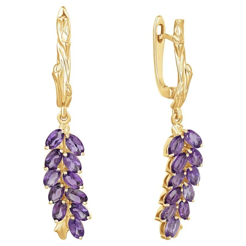 Серебряные серьги с натуральным аметистом - коллекция Флора. Серебряные серьги 925 пробы с покрытием желтое золото. Цвет покрытия соответствует швейцарскому цветовому стандарту NIHS -FF24ct и цвету чистого золото 999.99. На последней фотографии мы разместили сравнительную фотографию 3 цвета золотого покрытия. Помимо предания золотого цвета Вашему изделию, тонкий слой золота защищает от окисления. Для более стойкого эффекта золочения и долговечности покрытия мы дополнительно наносим подслой палладия (Pd). Средний вес изделия с камнями 7.71 гр. Месторождение(я): Аметист (Приполярный Урал, Россия). Аметист (Натуральный) овал 3*5 мм., средний вес: 0.25 карат. Размер лицевой части: 9*48 мм. Все изделия собственного производства. Гарантия 12 месяцев.Арт. 7849