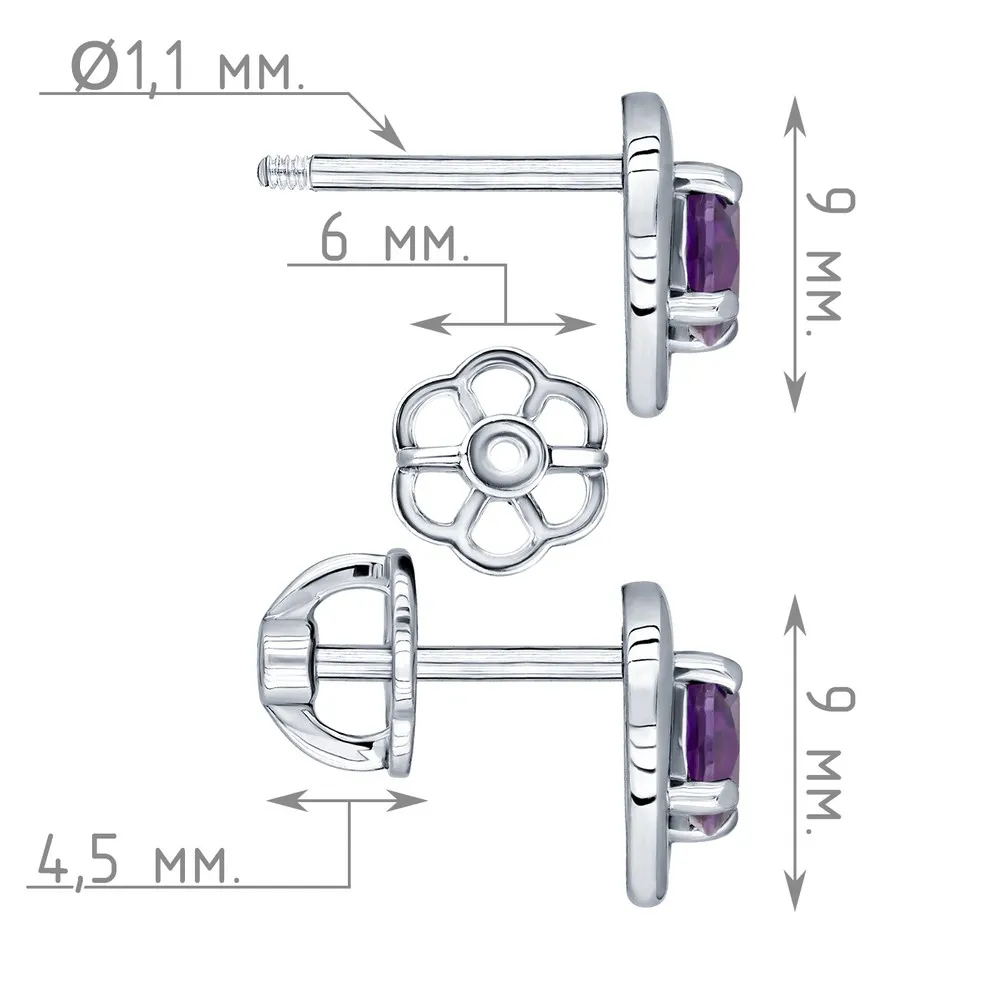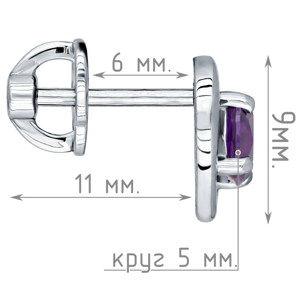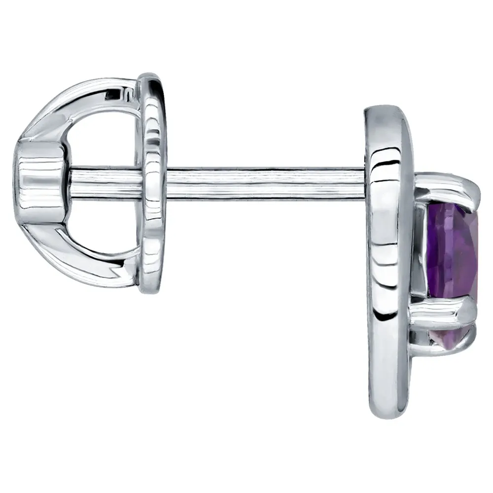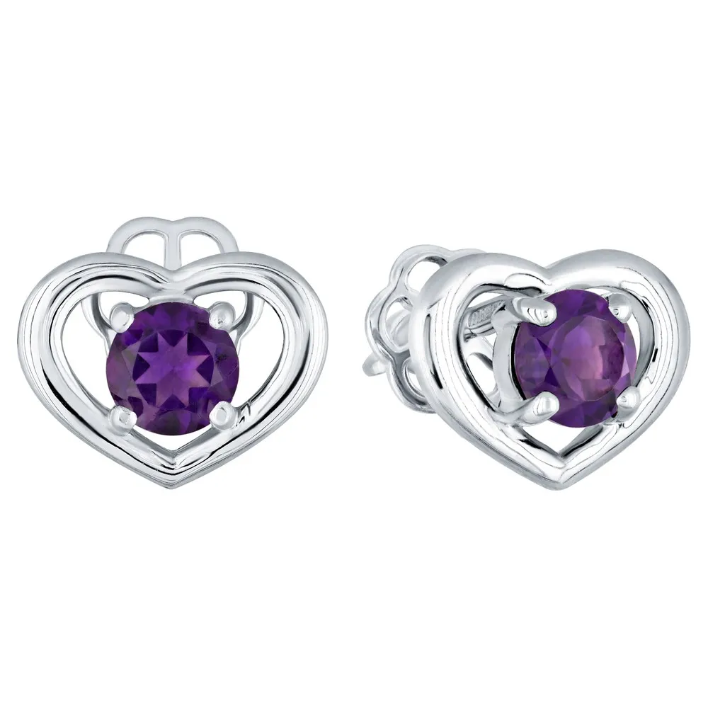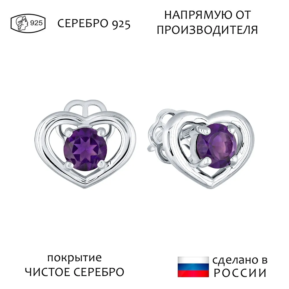 Серебряные серьги гвоздики (пусеты) с натуральным аметистом (темным) - Сердце / покрытие Чистое Серебро.