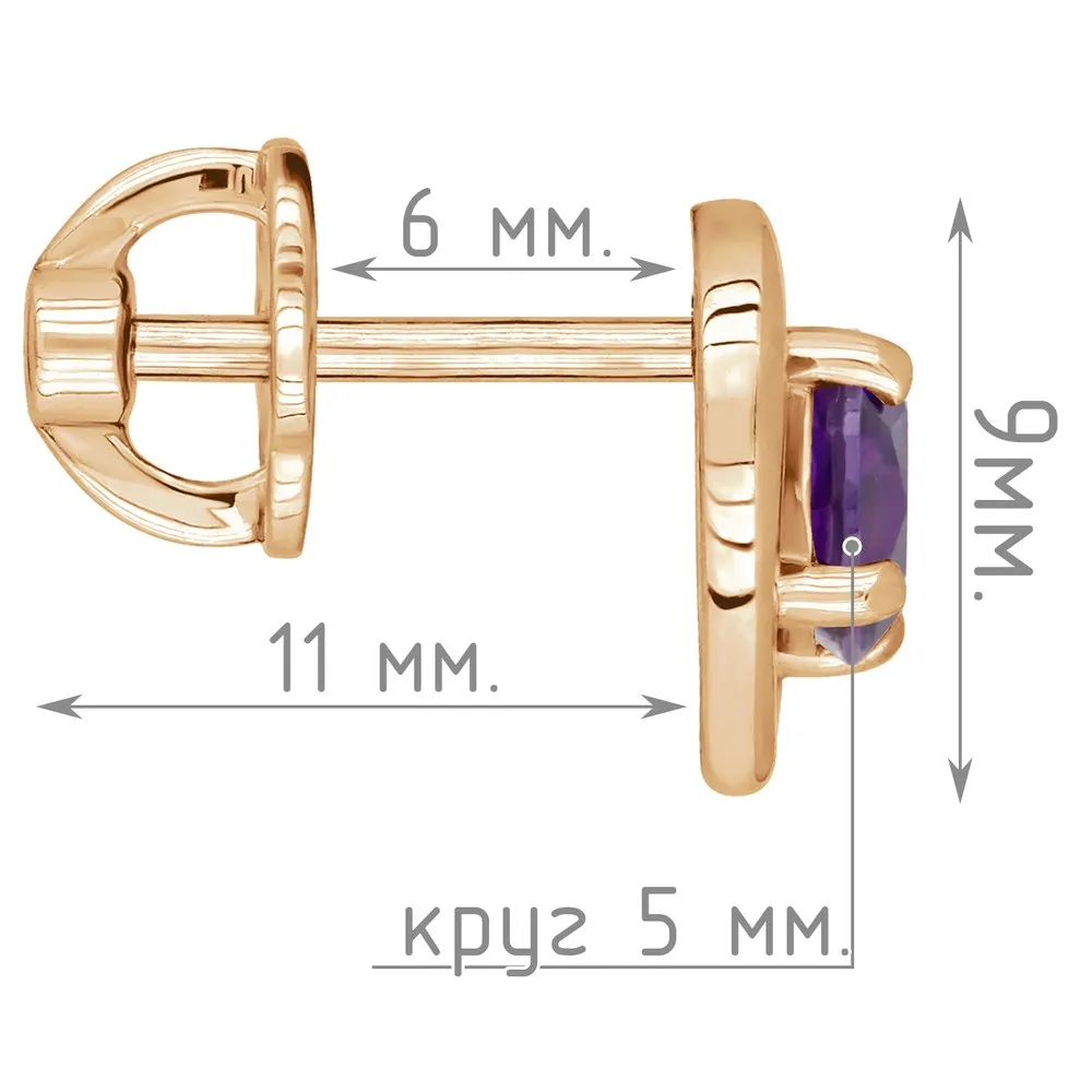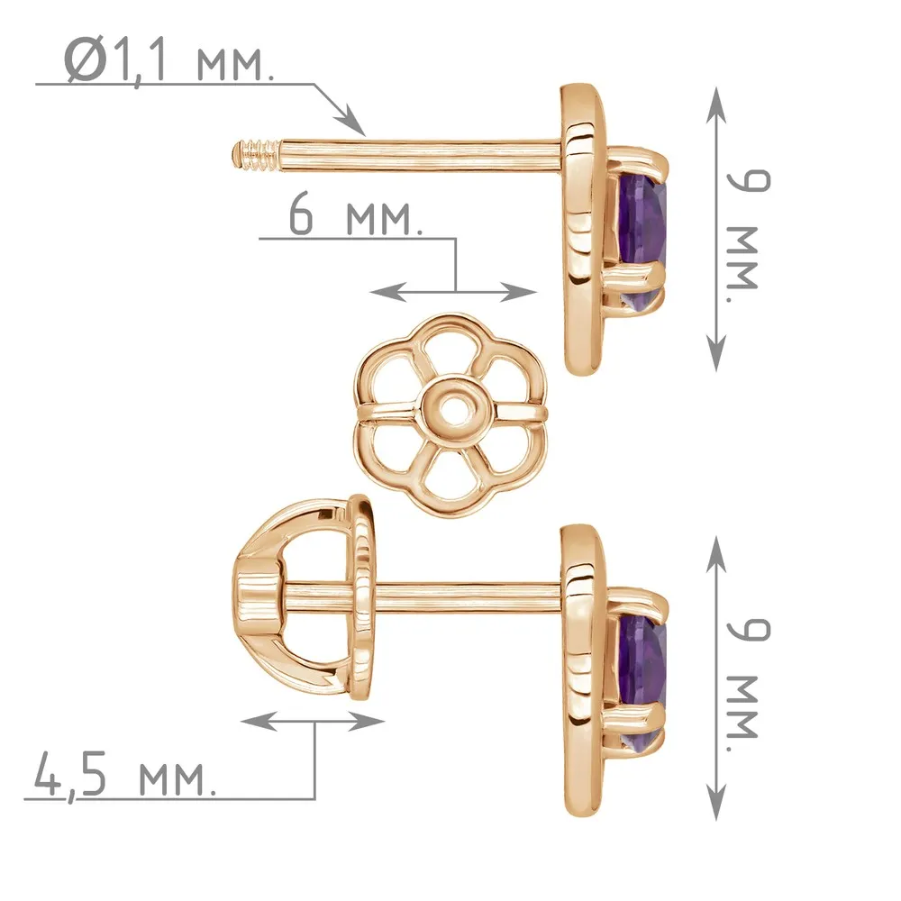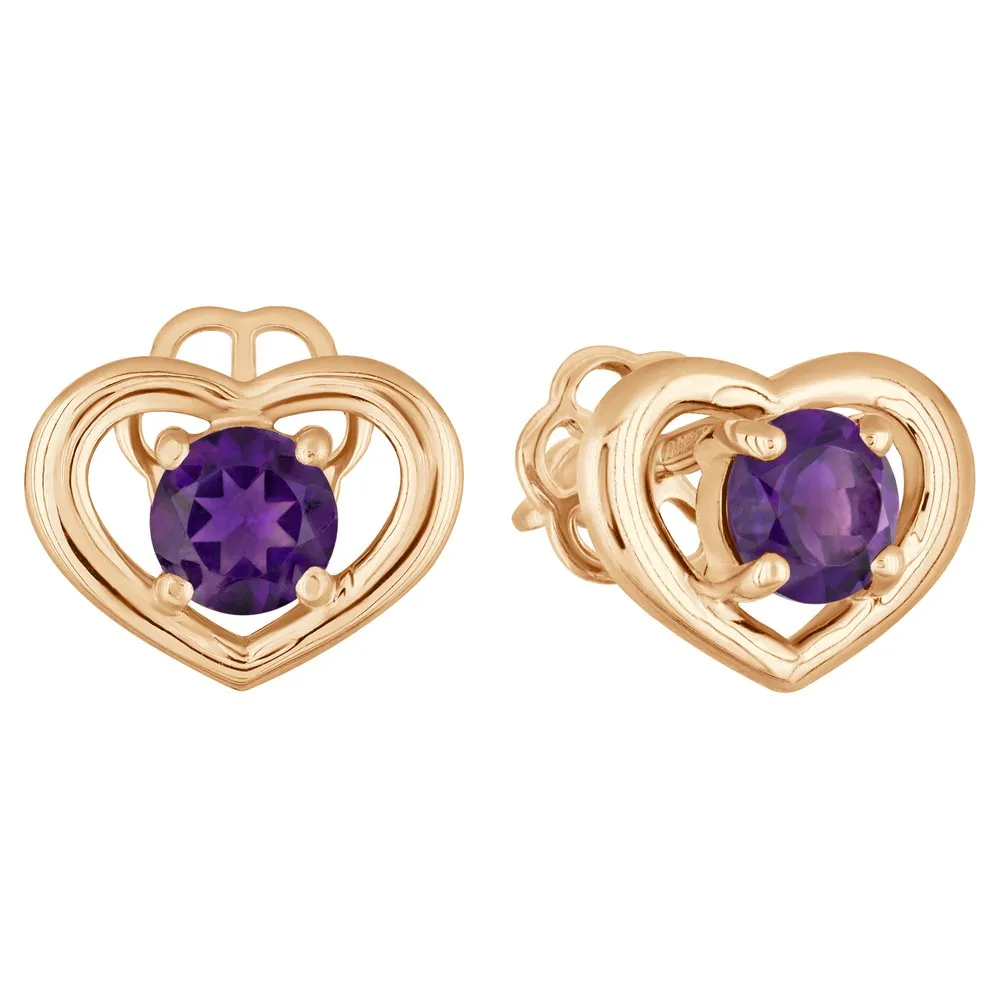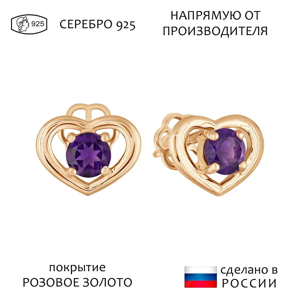 Серебряные серьги гвоздики (пусеты) с натуральным аметистом (темным) - Сердце / покрытие Розовое Золото.